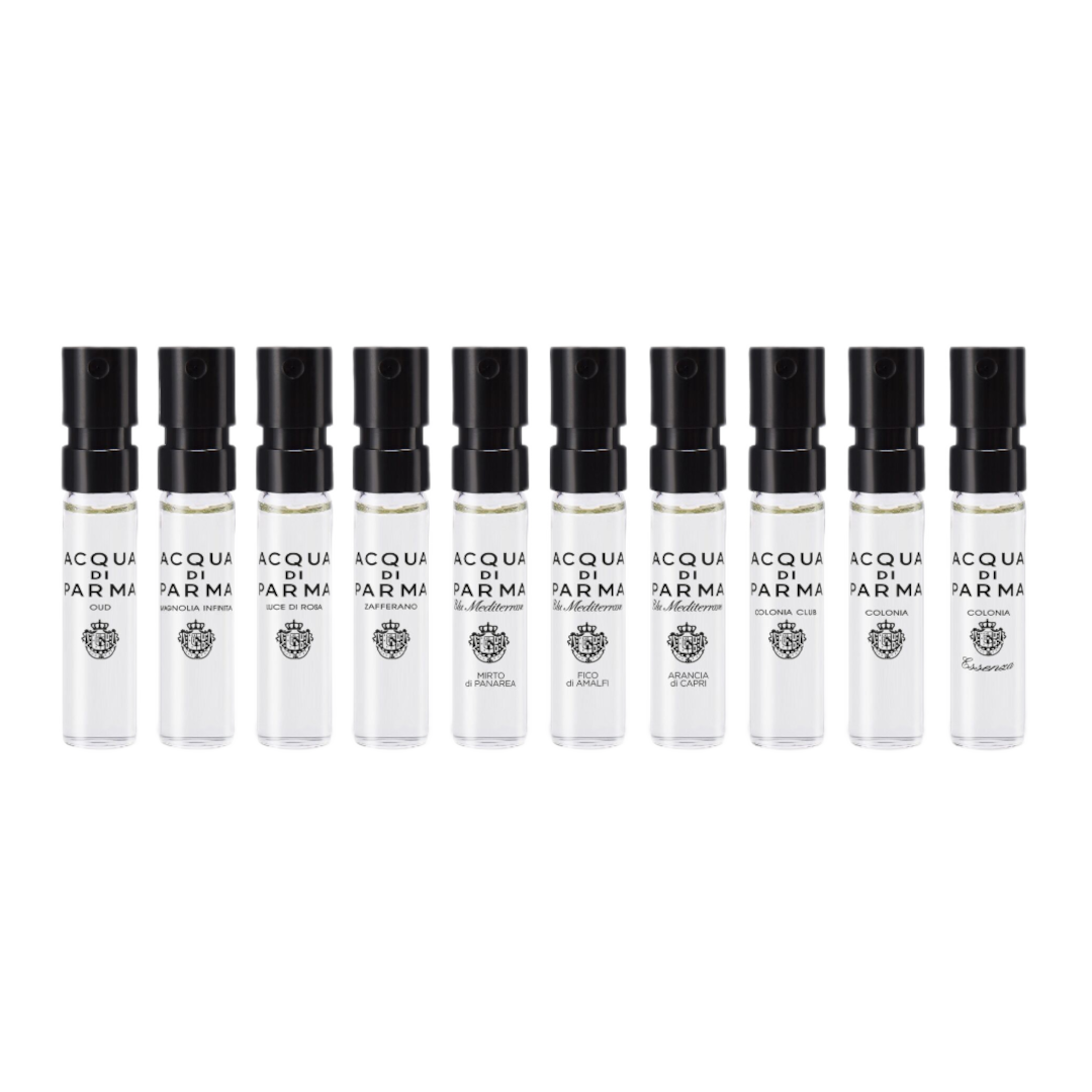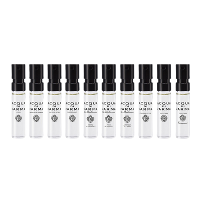 A perfume sample set with a selection of 10 of the Maison's most iconic fragrances: Colonia, Colonia Essenza, Colonia C.L.U.B., Arancia di Capri, Fico di Amalfi, Mirto di Panarea, Luce di Rosa, Zafferano, Magnolia Infinita and Oud.