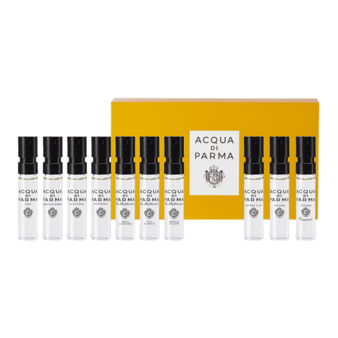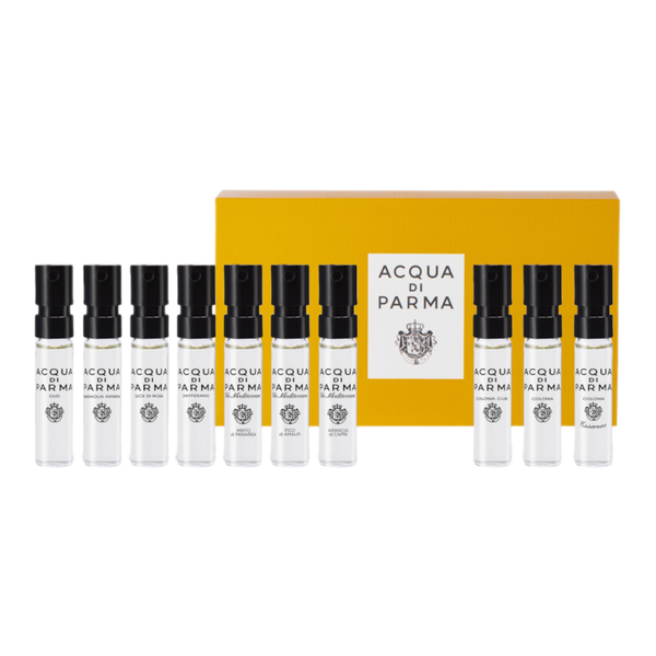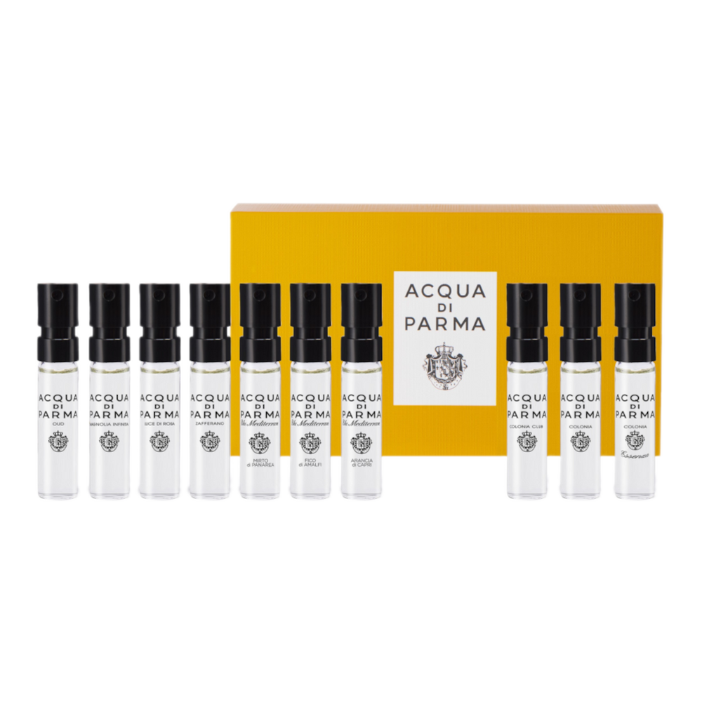 Acqua di Parma's Selection Set features 10 iconic fragrances in 1.5ml formats from three different lines: