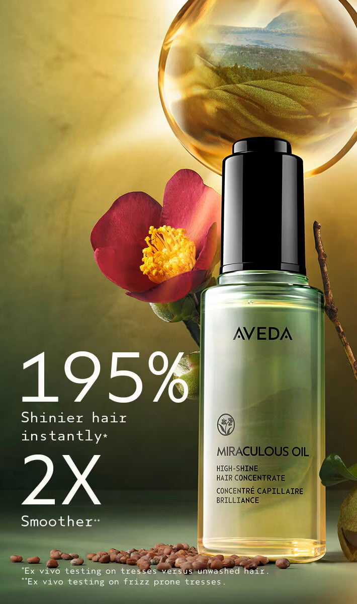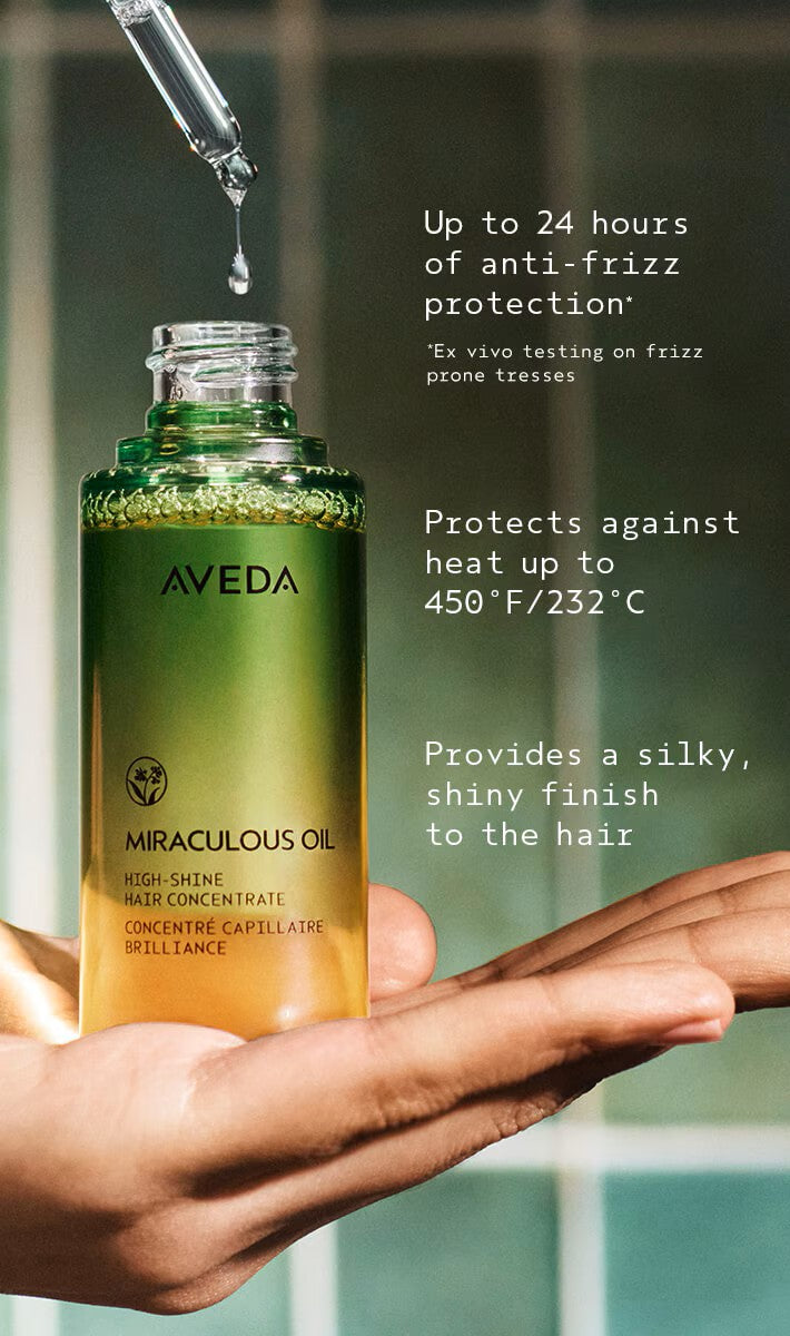 Aveda Miraculous Oil High Shine is a precious concentrate that effortlessly wraps hair in light-reflecting shine and immerses your senses in a calming pure-fume aroma. Discover a blend of traditions in every drop. Infused with Tsubaki seed oil, harvested in part from Jeju Island and daikon seed oil, responsibly sourced from cooperative farms in Willamette Valley, Oregon. This precious concentrate delivers 195% more shine, instantly and creates smoother hair, while immersing your senses in a calming pure-fume aroma.