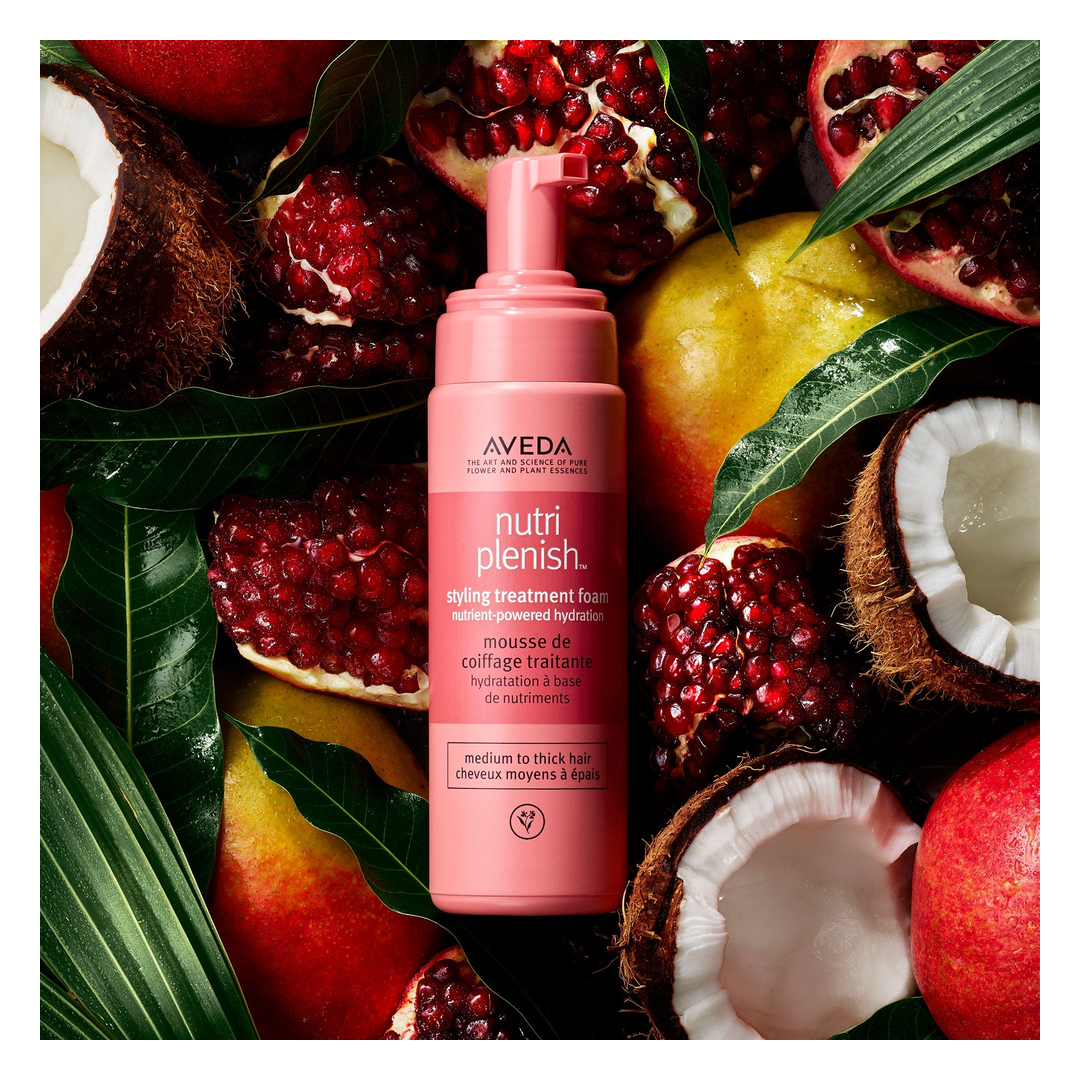 The Aveda Nutriplenish Styling Treatment Foam is a do it all styling foam. It adds a layer of heat protection for thermal styling up to 450°F, shine and smooths hair without feeling heavy or crispy, while a superfood complex nourishes hair to be healthy and strong. The vitamin superfood complex includes omega-5 rich pomegranate oil, mango butter for softness and coconut oil for lightweight hydration.