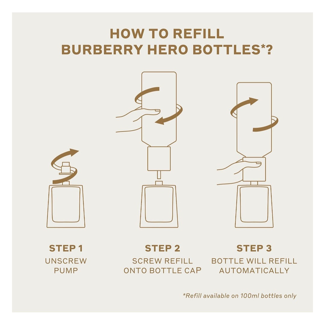 How To Refill: Remove the 100ml bottle cap, then unscrew the fragrance pump, and screw the refill onto the bottle's neck. The refill will stop automatically once the perfume bottle is filled. Unscrew the refill, screw the fragrance pump back onto the bottle and replace the cap. Your refilled Burberry Hero fragrance is now ready to be used.