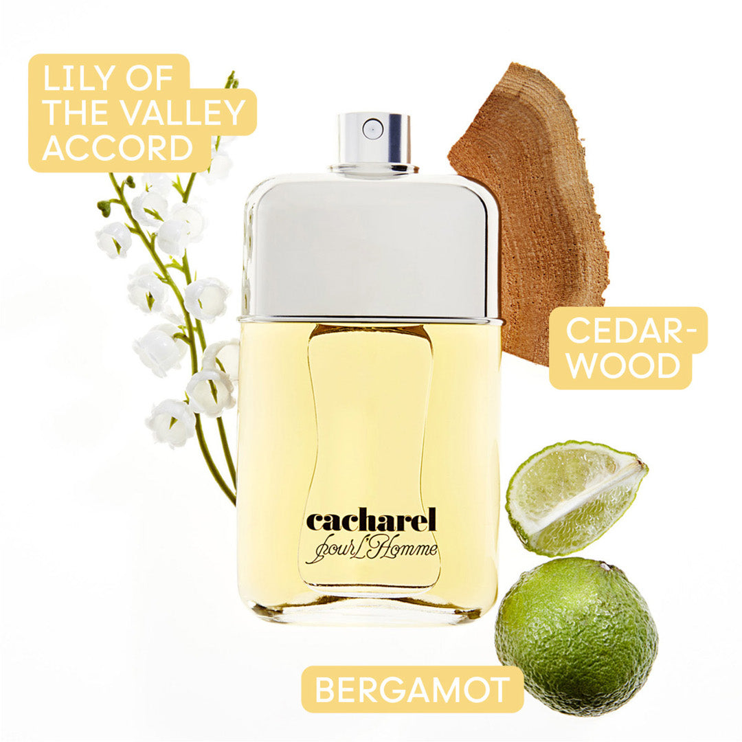 Cacharel Pour Homme opens with a meeting of citrus and aromatic facets, lemon and lavender, before sinking into a sun-warmed heart of ylang-ylang and subtly spicy nutmeg. As the fragrance dries down, woods and musk reveal their strength.