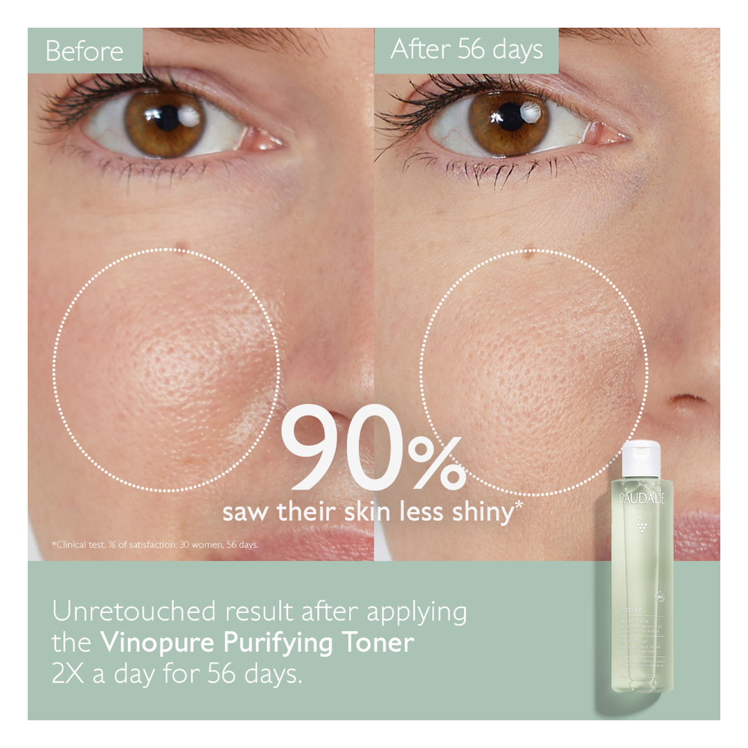 Use morning and evening. Apply the Caudalie Vinopure Purifying Toner onto cleansed skin using a cotton pad or clean fingertips, taking care to avoid the eye contour. Do not rinse.