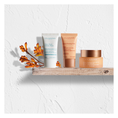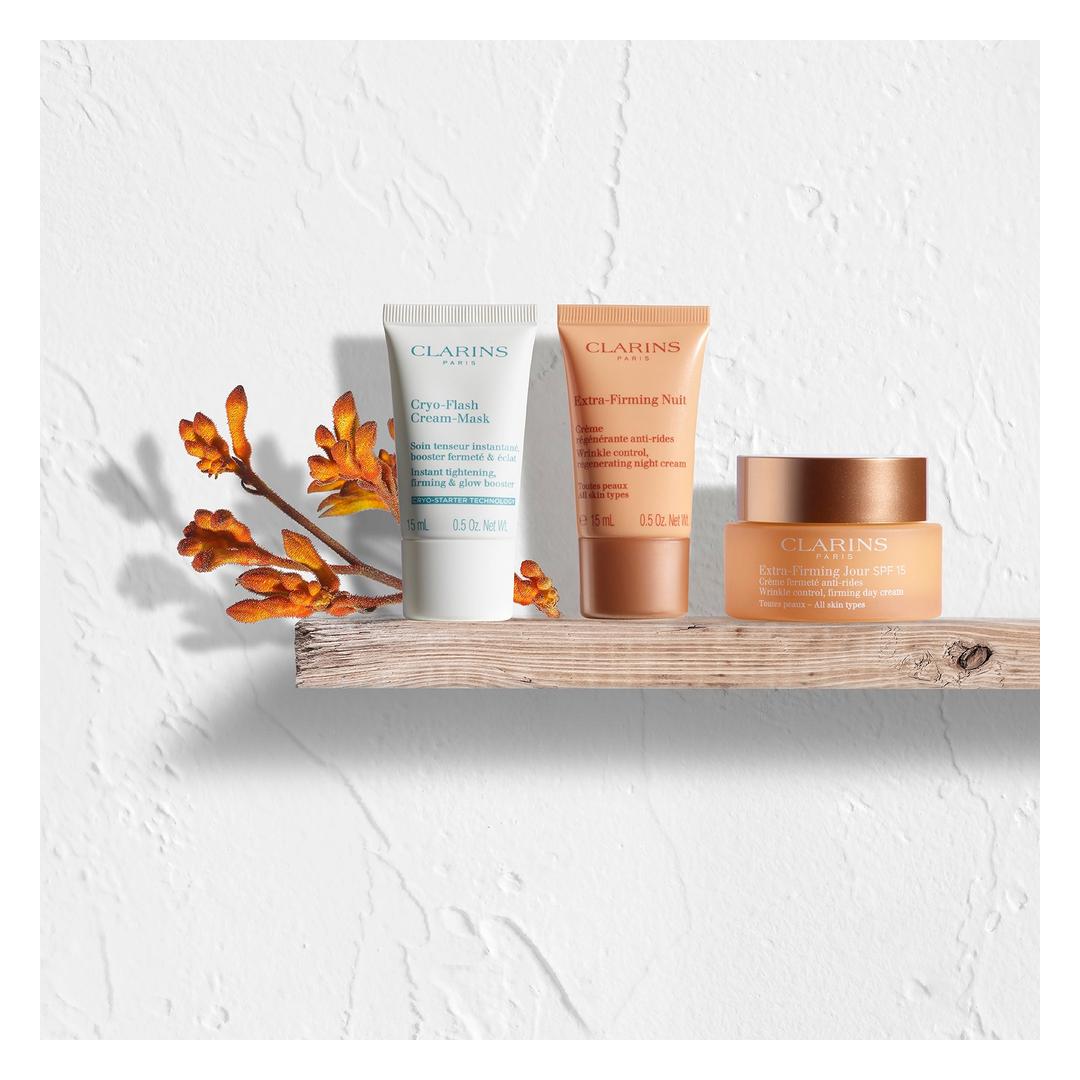 From day to night, keep your skin protected from the elements and the effects of gravity with the Clarins Extra-Firming skincare ritual.