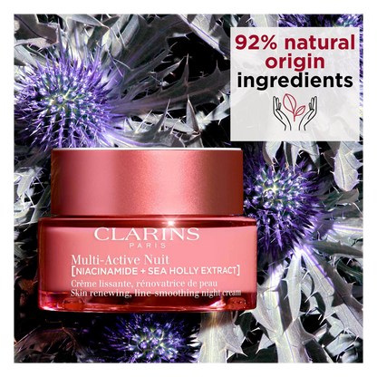 This night cream renews the skin while you sleep with a powerful tetrapeptide. Part of the Multi-Active range, which targets the first signs of ageing, the formula helps to rejuvenate the complexion. The night cream contains Clarins' Skin Charger Complex, which combines an innovative blend of niacinamide and organic sea holly extract, which reduce visible signs of ageing, including fine lines and wrinkles, stress and fatigue. The moisturiser contains 92% natural ingredients that strengthen the skin's barrier function, boosting its radiance so that the skin looks more youthful and rested.