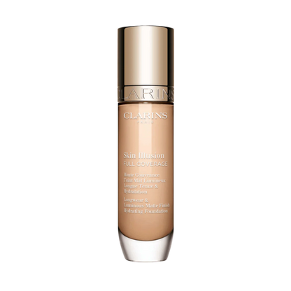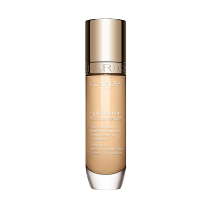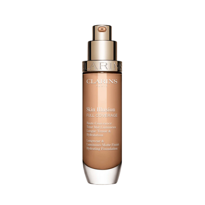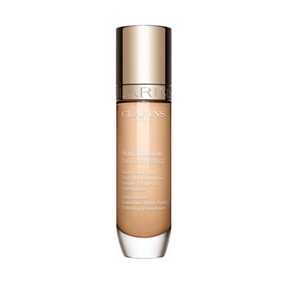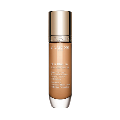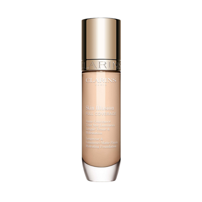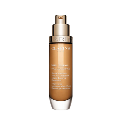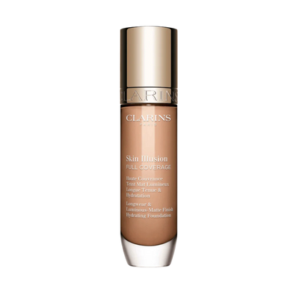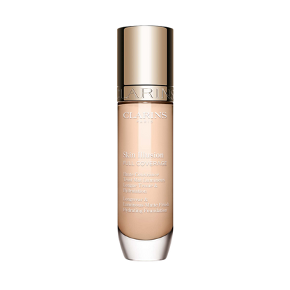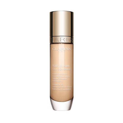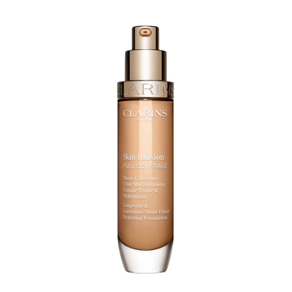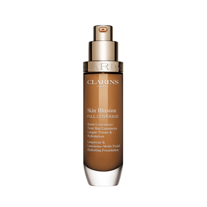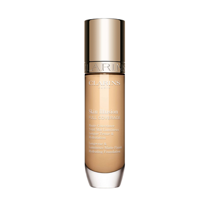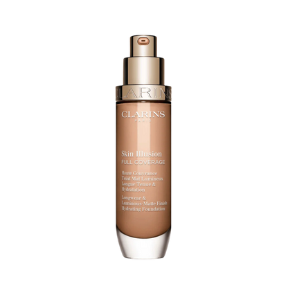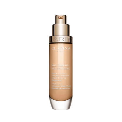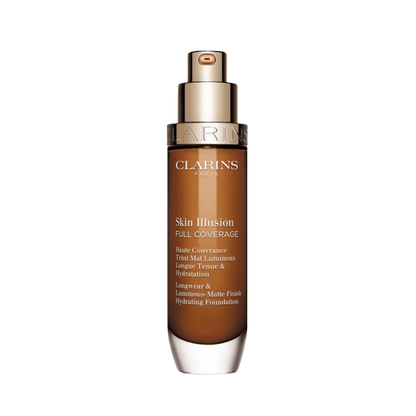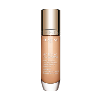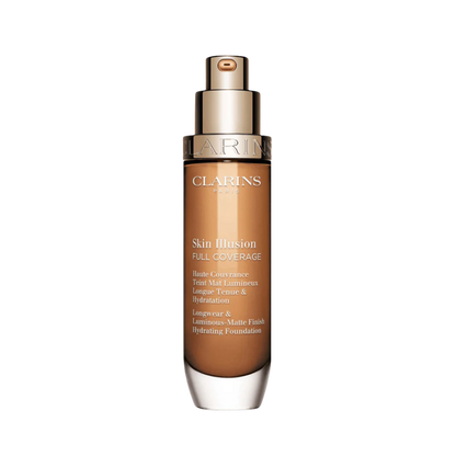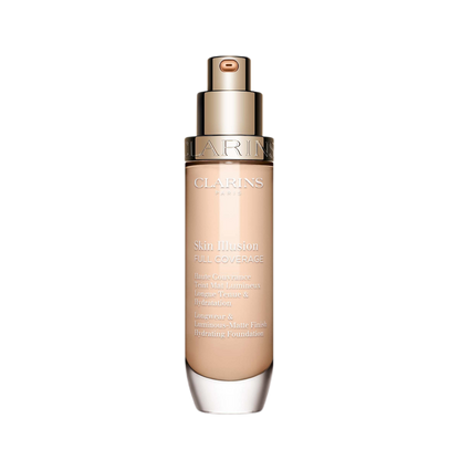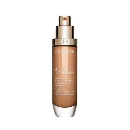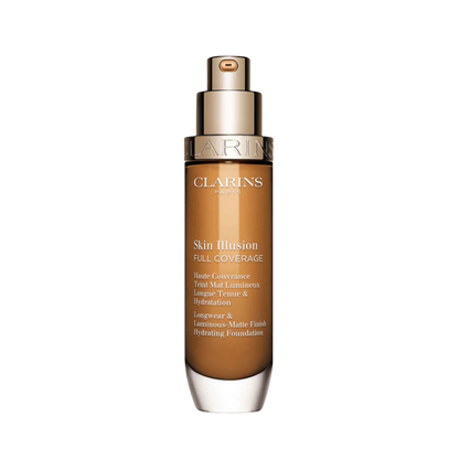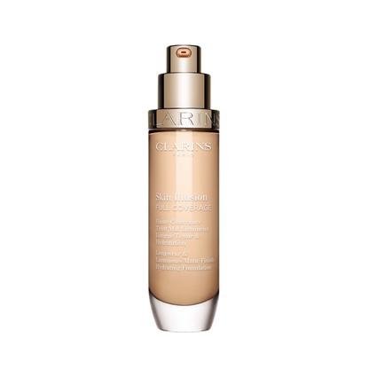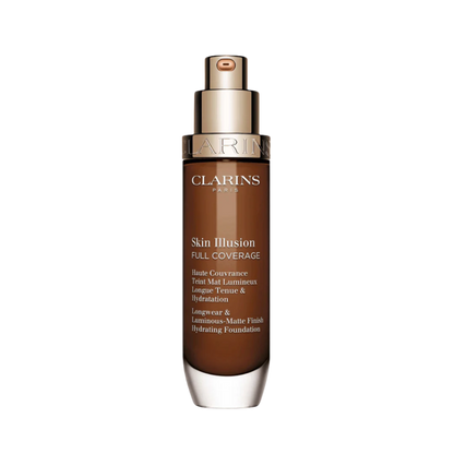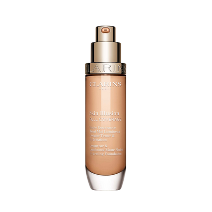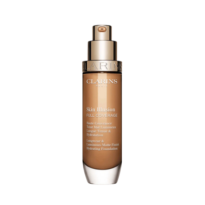 Looks like foundation but works like skincare. Clarins Skin Illusion Full Coverage has been developed to the same exacting standards as a skincare product: its formula is powered by a combination of active ingredients and plant extracts, which include the mattifying and purifying properties of Zinc Gluconate, to reduce the appearance of blemishes, as well as the combined action of hyaluronic acid and plant-based micro patch, which help to hydrate the skin for 24 hours*. This comfortable formula moves with your facial expressions for a long-lasting hold and 12H of luminous matte coverage. The result: smoother skin, a matte but luminous complexion and visibly reduced imperfections! Skin looks more beautiful, even bare, day after day.