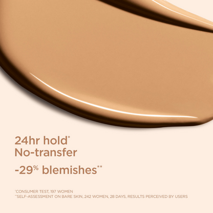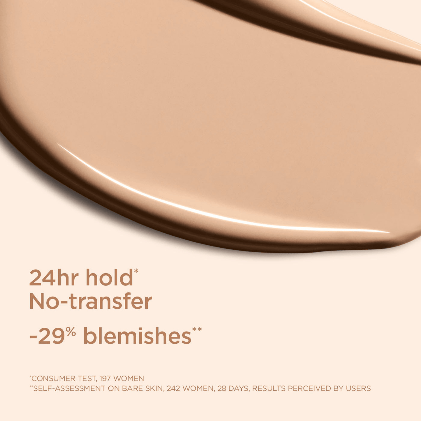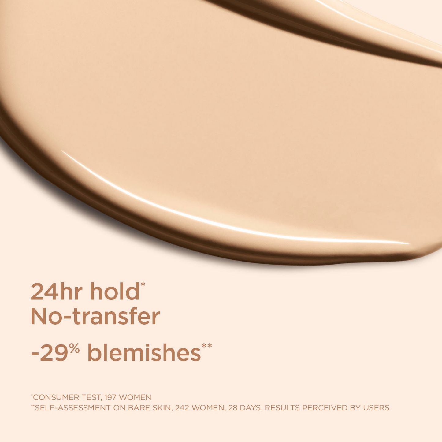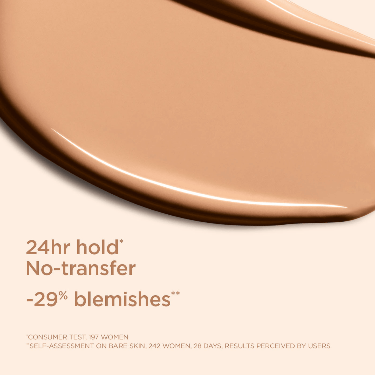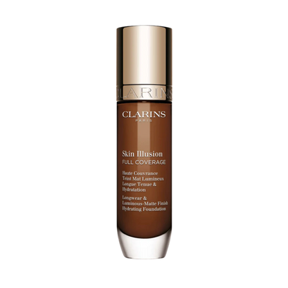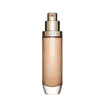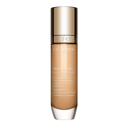 Looks like foundation but works like skincare. Clarins Skin Illusion Full Coverage has been developed to the same exacting standards as a skincare product: its formula is powered by a combination of active ingredients and plant extracts, which include the mattifying and purifying properties of Zinc Gluconate, to reduce the appearance of blemishes, as well as the combined action of hyaluronic acid and plant-based micro patch, which help to hydrate the skin for 24 hours*. This comfortable formula moves with your facial expressions for a long-lasting hold and 12H of luminous matte coverage. The result: smoother skin, a matte but luminous complexion and visibly reduced imperfections! Skin looks more beautiful, even bare, day after day.