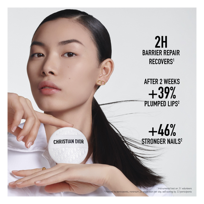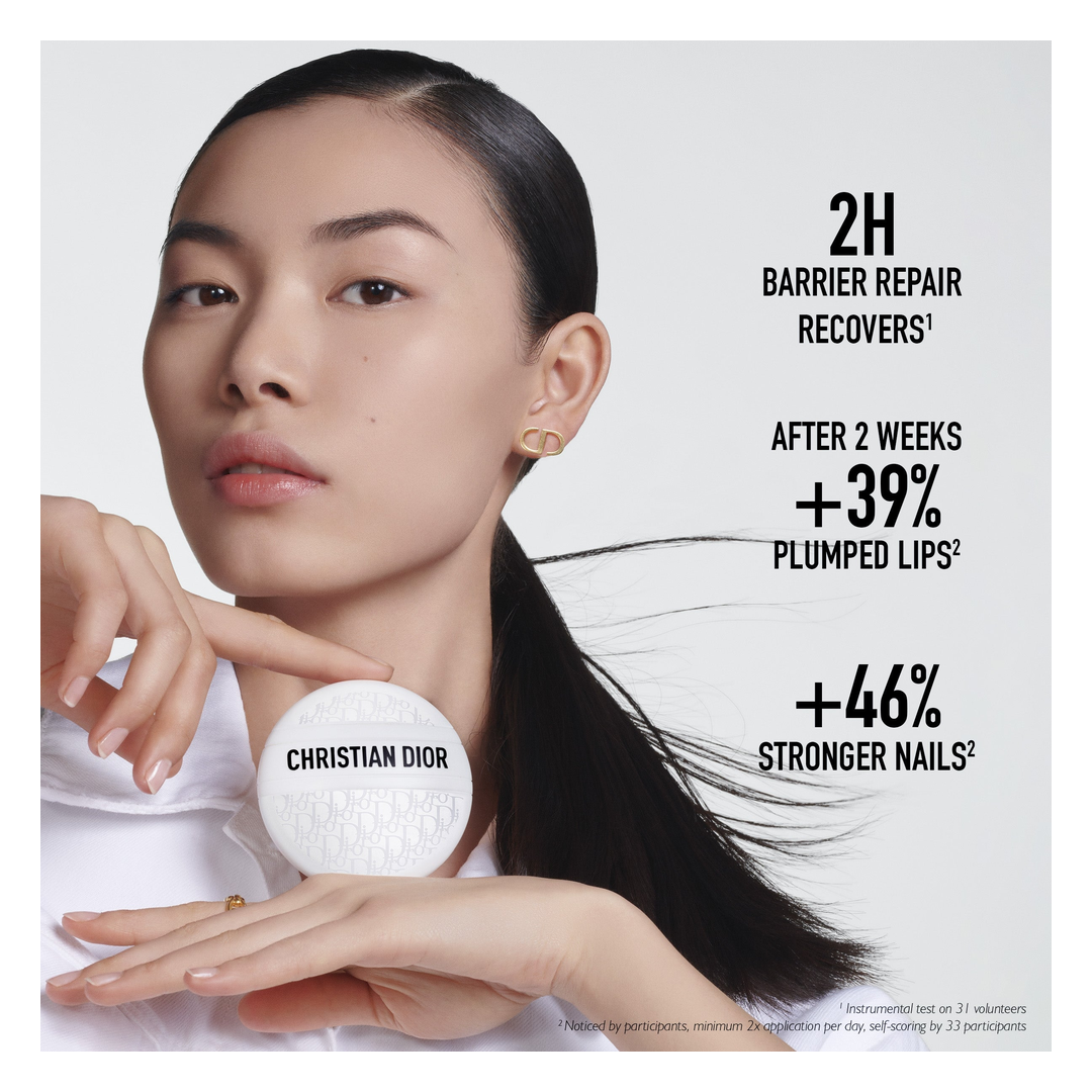 In its round design with a "Logomania" couture pattern, Dior Le Baume reveals a formula composed of 95%* natural-origin ingredients. On the skin of the hands, lips and body, the balm delivers a soothing texture.