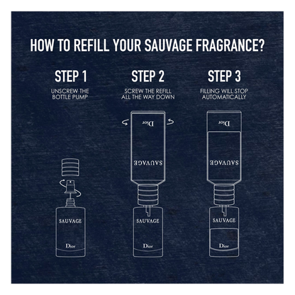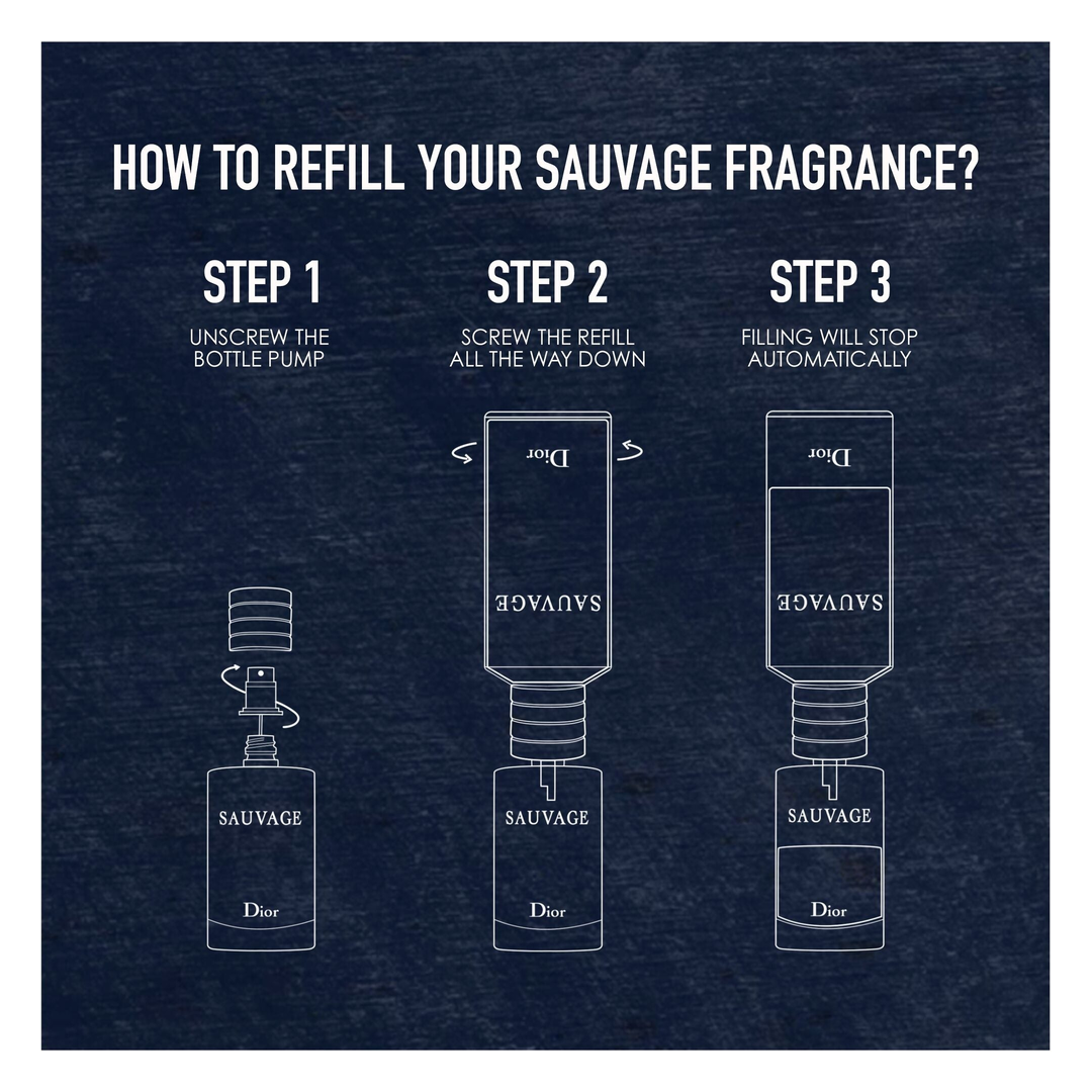 The user-friendly, eco-design of the 300 ml refill now allows you to refill your 100 ml Sauvage Eau de Parfum bottle in one easy step, without losing a single drop. Thanks to its innovative auto-stop system, filling stops automatically when the bottle is full.