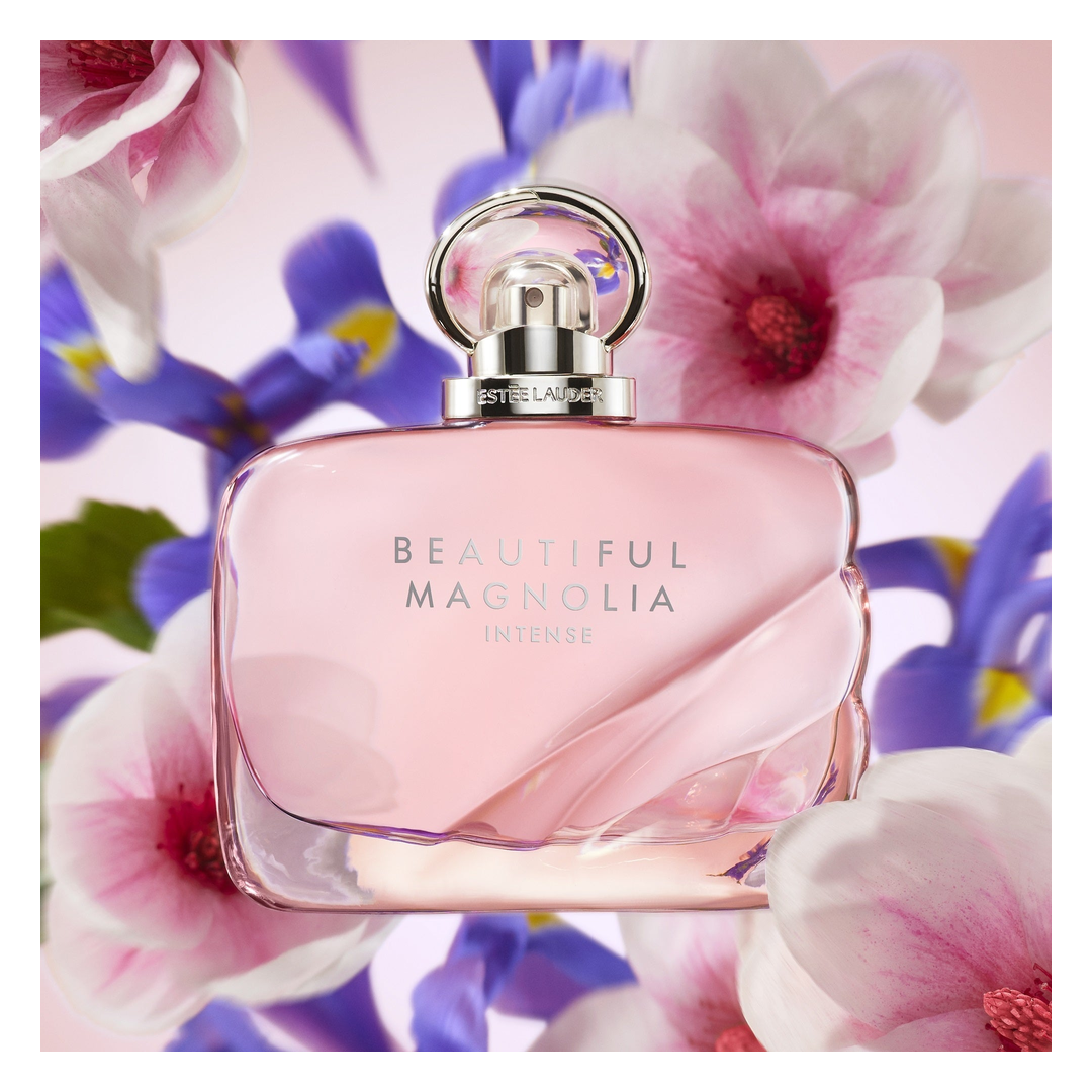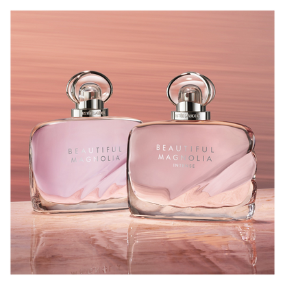 Featuring the same stunning bottle with a richer tinted juice to hint at the intensity of the fragrance, the intense version of Beautiful Magnolia offers an even more passionate signature. As it's packed with spicier, earthier notes, Intense is a chypre-floral fragrance, unlike the original fragrance, which only belongs to the floral fragrance family. Beautiful Magnolia Intense takes away some of the freshness and sweetness of the original, replacing it with deeper and slightly darker fragrance notes - like patchouli and leather - without overpowering the magnolia note; it is the star of the show, after all!