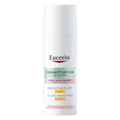 "Fight blemishes whilst reducing post-acne marks with the Eucerin DermoPurifyer Protective Fluid SPF30, a mattifying sunscreen with a lightweight finish." - Darcey, Escentual Beauty Team.