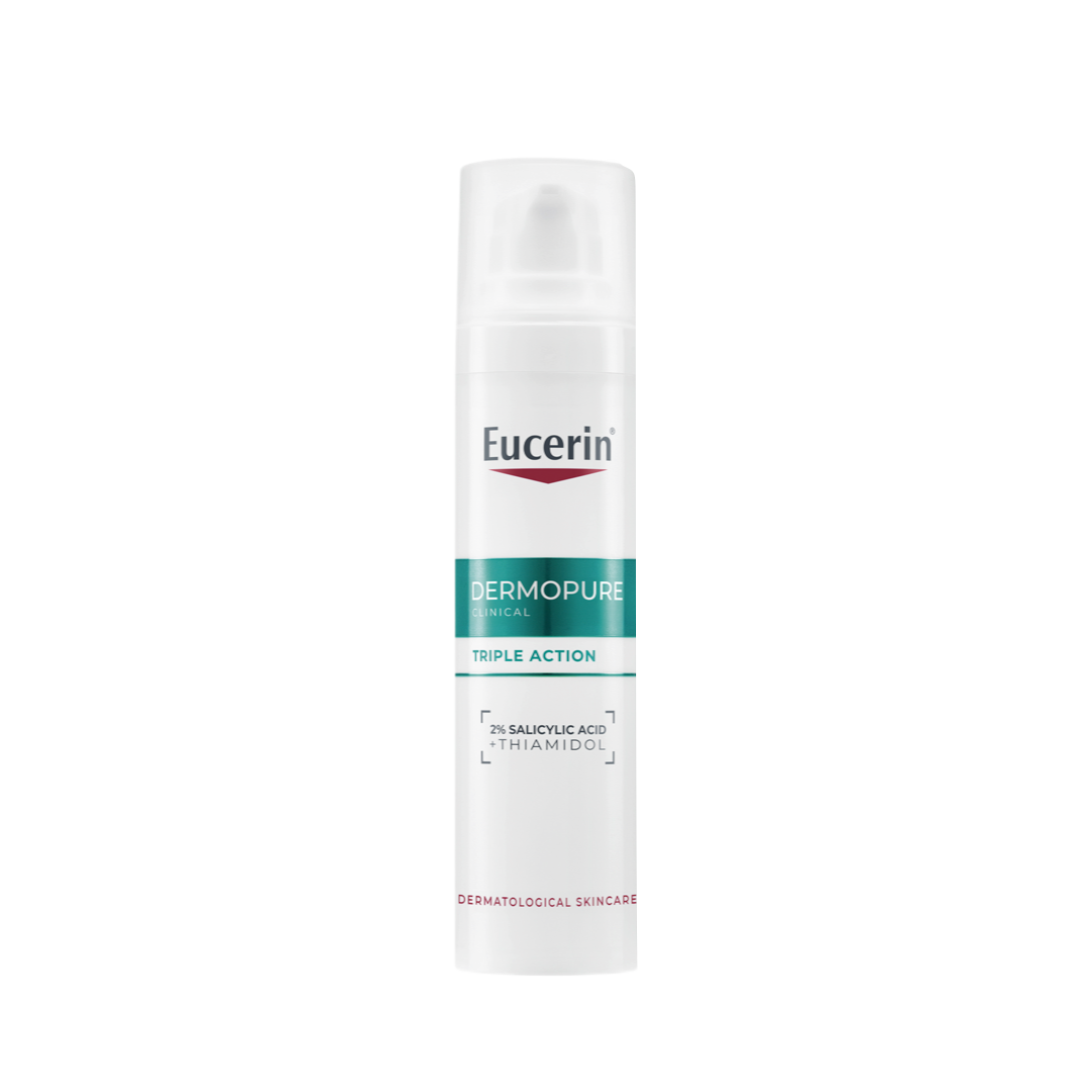 Eucerin Dermopure Triple Action Serum is a powerful facial fluid recommended by dermatologists and clinically proven to address the three main types of imperfections: blemishes, post-acne marks, and comedones. It effectively targets the skin microbiome while providing essential hydration. This serum for pimples and blackheads corrects the key signs of acne, while also balancing the skin's microbiome and ensuring hydration. Its clinically proven formula delivers noticeable results from the very first day of use. The Eucerin Dermopure Triple Action Serum contains 2% Salicylic Acid (BHA) to exfoliate the skin and reduce blemishes, along with patented Thiamidol, the most effective anti-mark ingredient.