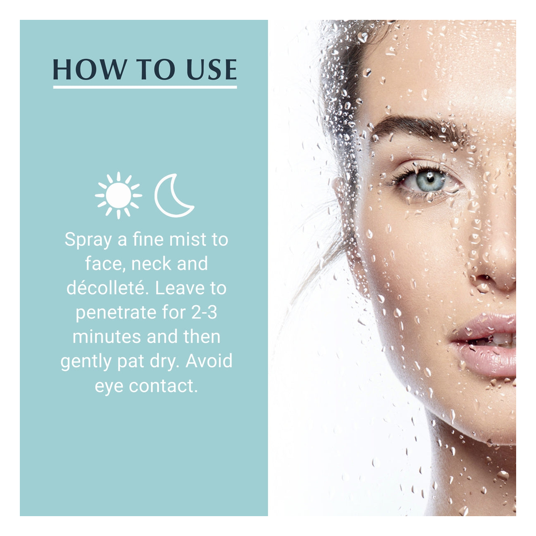 Hold the can 20cm from your skin and spray over the face, neck and decollete, taking care to avoid contact with the eyes. Leave to absorb for 2-3 minutes and then pat dry.