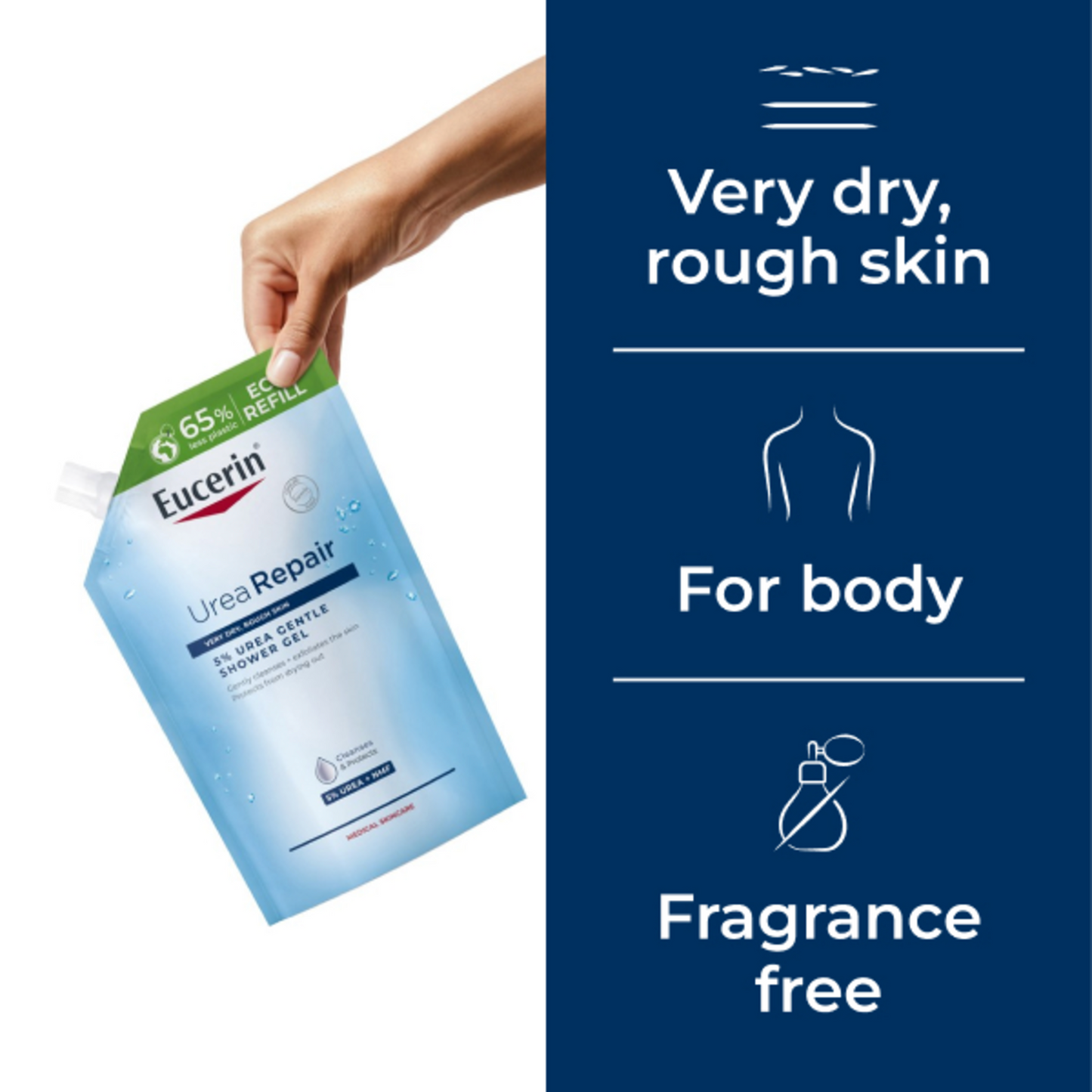 The Urea Repair 5% Urea Gentle Shower Gel in a refill format cleanses and exfoliates dry, rough skin very gently while preserving the skin's natural barrier and protecting the skin from drying out. The skin is perceivably smoother and feels replenished.