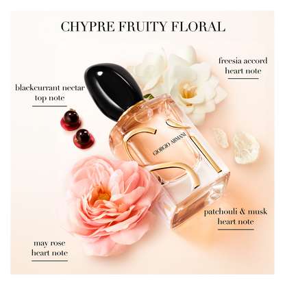 Si Eau de Parfum is soft and warm with a hint of sophisticated sweetness. Fresh, green and addictive in its initial impression, the elegance of freesia and the exquisite honey hues of rose de mai absolute make this perfume truly distinctive. The long-lasting and sensual notes of oakmoss and patchouli softly define this fragrance as a captivating modern chypre.
