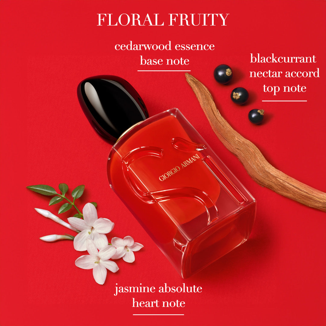 Fresh at first, Si Passione opens with blackcurrant liqueur and pear before spicy accents of pink pepper unfold like a burst of adrenaline. In the heart, feminine facets of rose and jasmine give the perfume a strong and passionate core before an unforgettable dry down of warm vanilla and cedarwood reveals itself.