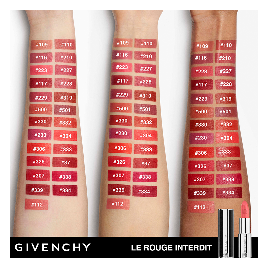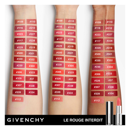 Le Rouge Interdit Intense Silk's highly-pigmented colour palette includes the most iconic and the most fashionable reds. Discover Givenchy's signature brown-toned red (37) and the most luminous red with a hint of yellow (306).
