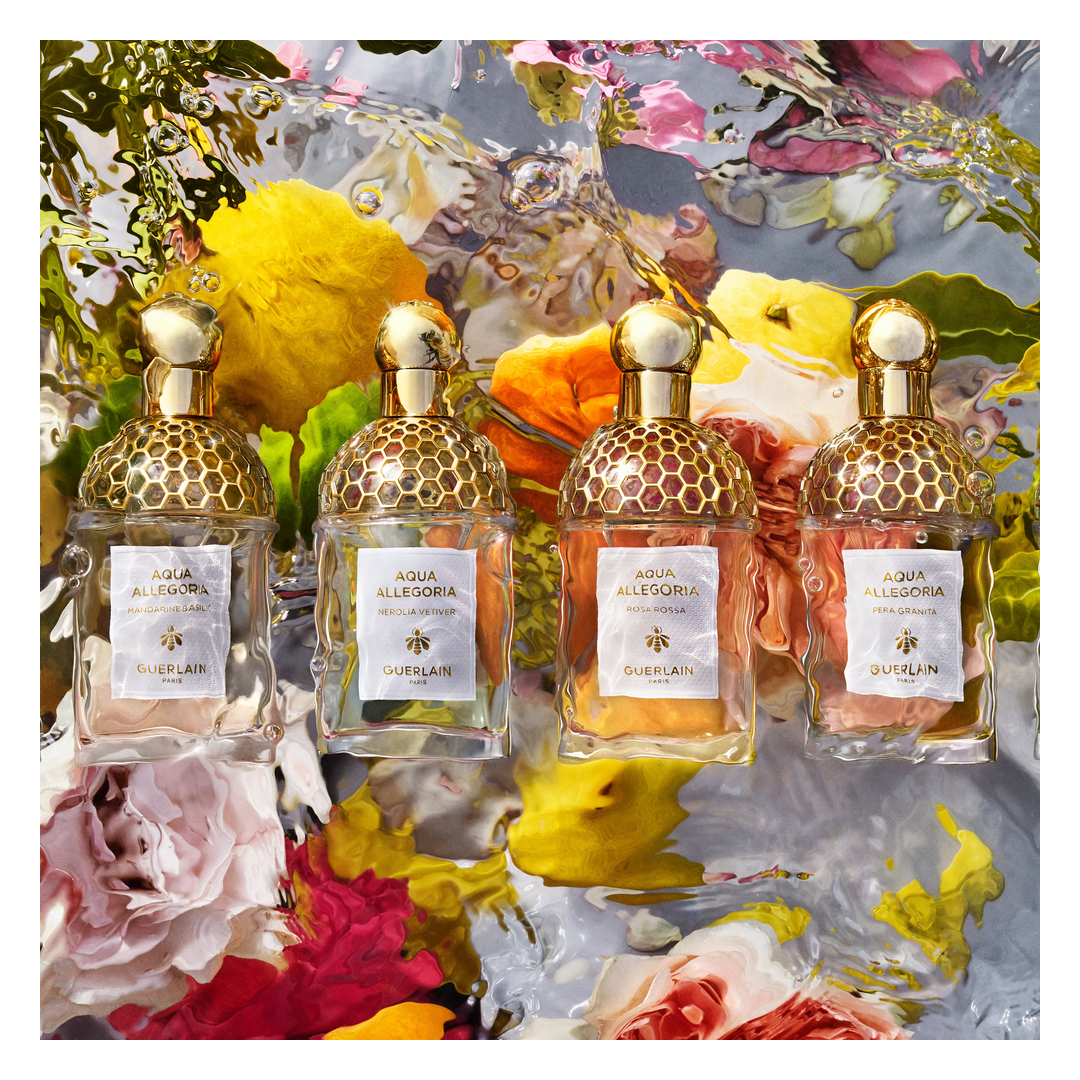Rosa Rossa's sophisticated citrusy floral trail has a bottle that is equally as elegant to match; bottled in the Aqua Allegoria style, the bee-inspired bottle is encased in golden honeycomb pattern, with a round golden lid embossed with GUERLAIN's signature bee insignia. All aspects of the design are linked to GUERLAIN's ongoing commitment to nature; from its bee-inspired design to its up-to-95% natural ingredient formula.