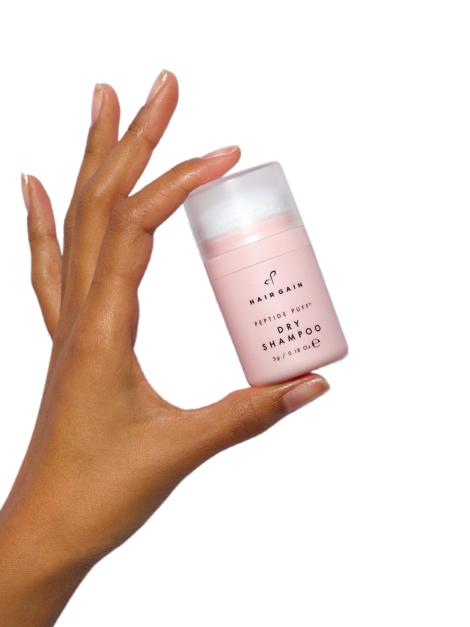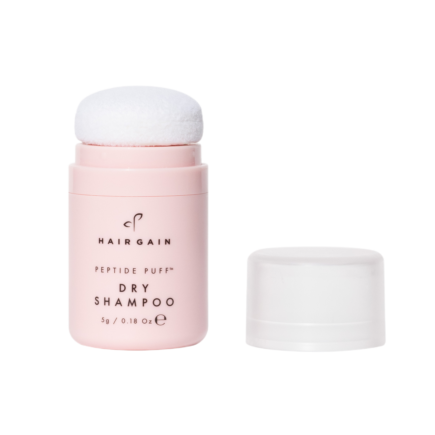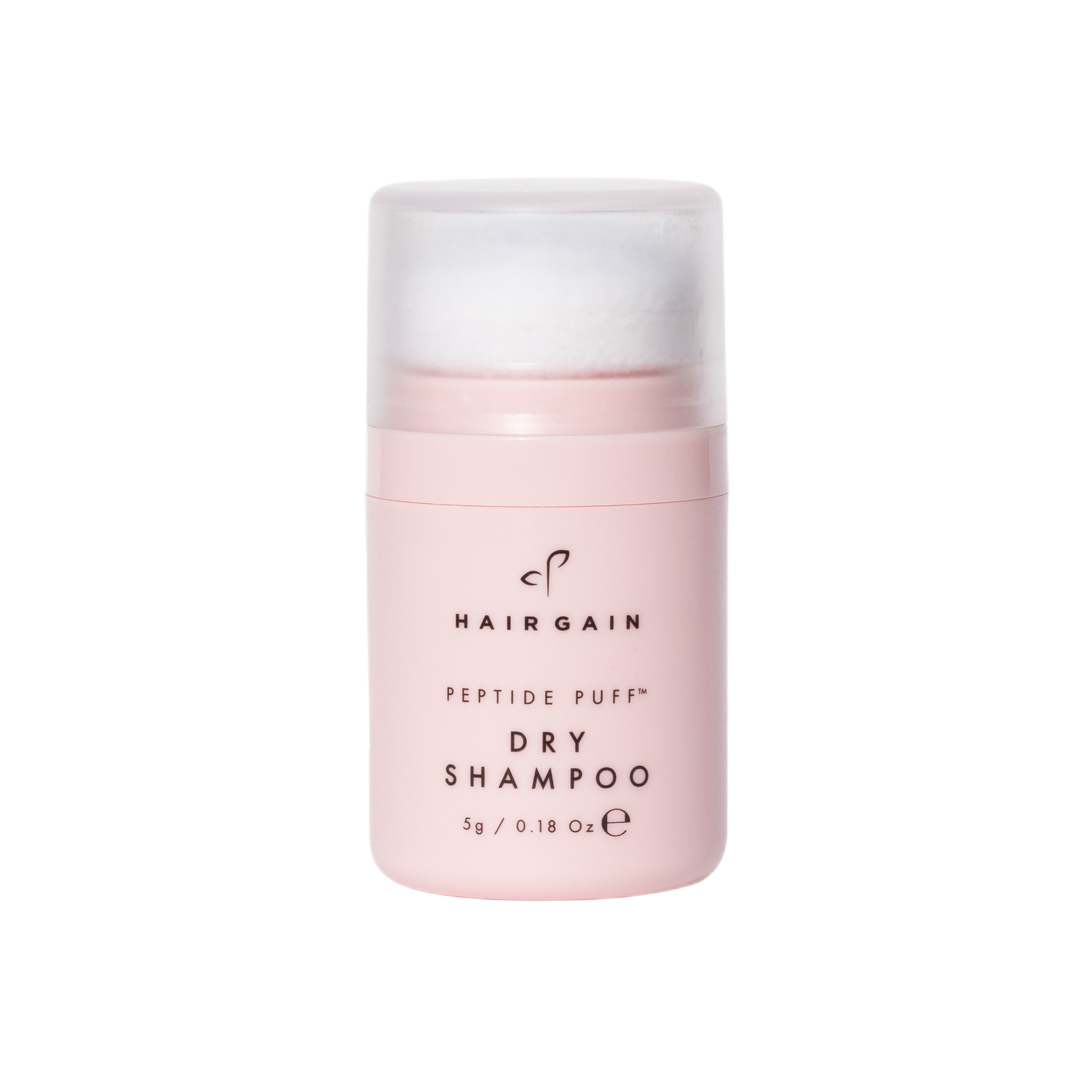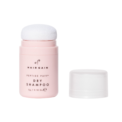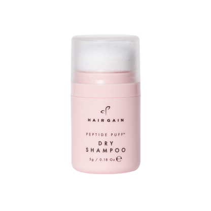 The Hair Gain Peptide Puff Dry Shampoo is a finely milled dry shampoo for all hair types. Unlike many other dry shampoos, the Peptide Puff comes in a non-aerosol format; it has a sustainable, padded puff applicator that's dabbed directly onto the hair.