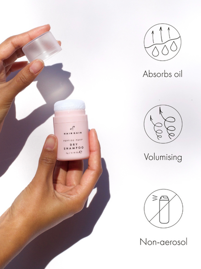 Hair Gain is loved for its vegan hair growth supplements, so it's no wonder the Peptide Puff does more than refresh the hair. Its gentle formula is recommended and endorsed by trichologists (scalp experts). It is packed with a scientifically formulated blend of active ingredients to care for your scalp and hair in between washes.