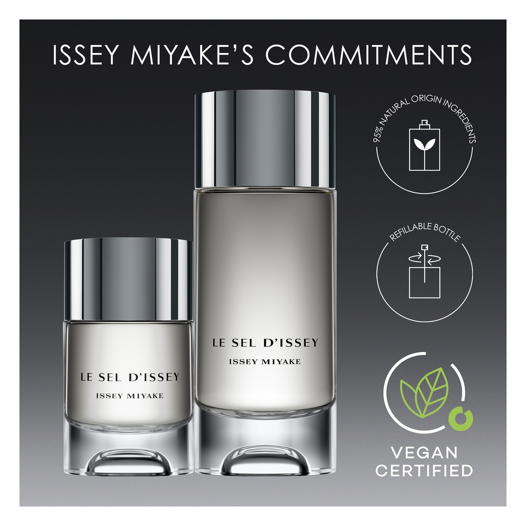 Made with 95% natural origin ingredients and 100% natural origin French alcohol, Le Sel d'Issey is a fresh, woody marine perfume. A vegan fragrance in which the power of salt is revealed by masculine earthy notes. With this new Eau de Toilette, perfumer Quentin Bisch gives scentless salt a fragrance, bringing an olfactory dimension to the otherwise odourless substance. This vibrant perfume journeys from the sea to the land, expressed through two olfactive polarities. The salty polarity encapsulates the sea with its vigorous salt accord. Natural origin marine seaweed blends with natural origin oak moss '” a type of algae that migrated inland, linking to the fragrance's second olfactive polarity. Enhancing the freshness of the salt accord, notes of sparkling ginger rush forth in the earthy polarity. Woody notes reveal their intensity, infusing the fragrance with density and texture. Natural sand vetiver combines with cedarwood '” a natural upcycled ingredient distilled from side stream dust in furniture making. The dynamic interplay between the salty and earthy polarities invigorates the fragrance, for a raw and powerful masculinity.