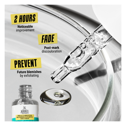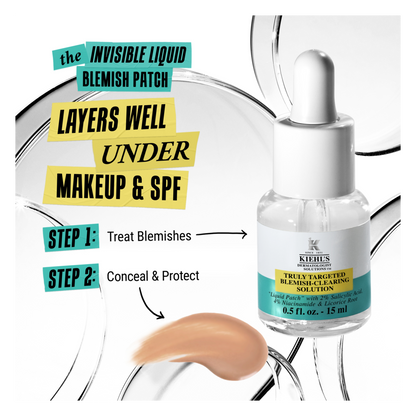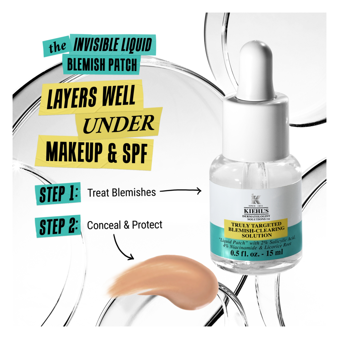 The Kiehl's liquid blemish solution with 2% Salicylic Acid is specifically formulated to provide visible results on blemishes and post-blemish marks. Concentrated with 2% Salicylic Acid, 4% Niacinamide and 0.2% Licorice Root, our formula targets the causes of blemishes, as well as calming and fading post-mark discouloration. Using our exclusive "liquid patch" technology, our blemish-clearing solution creates a breathable seal that layers seamlessly with sunscreen and under makeup.