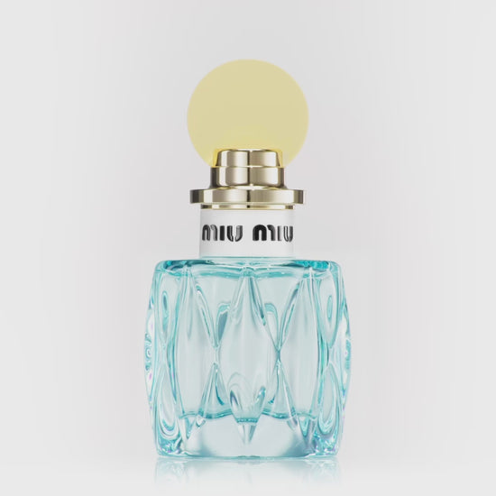 About the Bottle - In a nod to Miu Miu’s irreverent codes, L’Eau Bleue’s bottle channels the luxury house’s iconic matelassé leather handbags. Crystal-clear and faceted, the turquoise-tinted glass glitters and glints in the light. A black and white Miu Miu tag ring circles the collar, crowned with a soft pastel yellow sequin-shaped stopper.