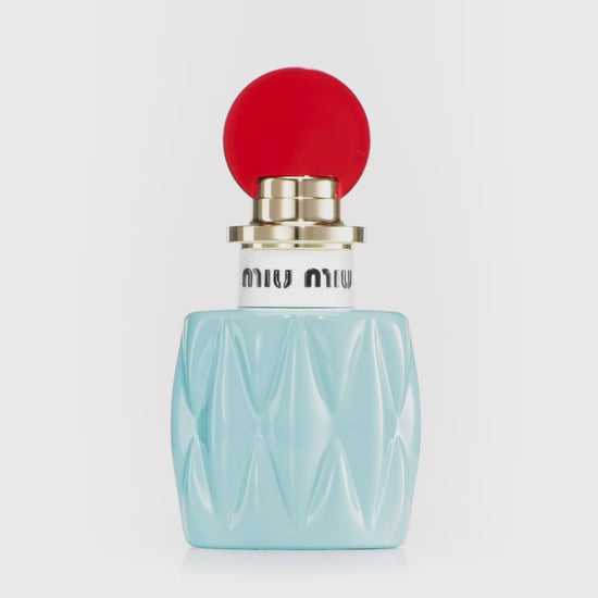 Channeling Miu Miu’s irreverent codes, L’Eau de Muguet’s bottle conjures the texture of the luxury house’s iconic matelassé leather handbags. The brand’s signature azzurro blue tints the opaque glass, in a vibrant contrast with the translucent ruby red of the sequin-shaped stopper, and the collar’s black and white Miu Miu tag ring.