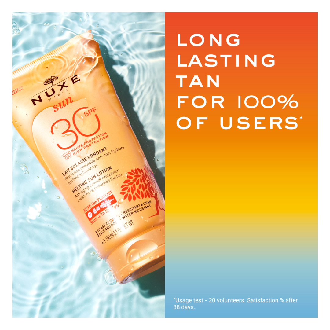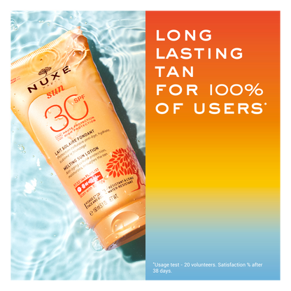 The Nuxe Mon Melting Sun Lotion For Face and Body SPF30 shields skin against UVA and UVB rays. It has a weightless melting cream texture that effortlessly absorbs into the skin, leaving a satin finish that gives the skin a subtle glow.