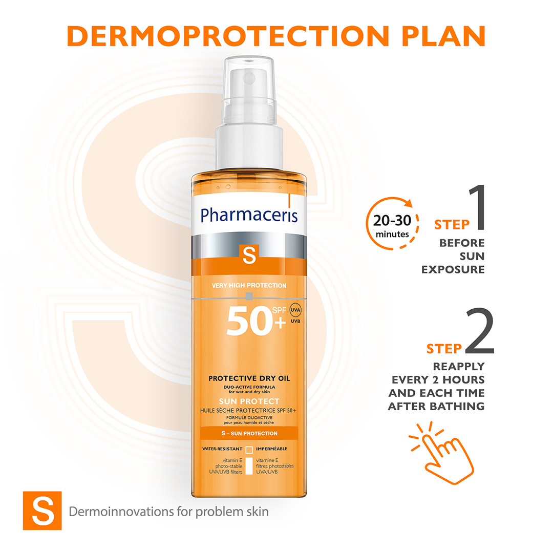 Apply the Pharmaceris dry oil at least 20 minutes before sun exposure. Reapply every two hours, or after bathing, swimming and physical effort.