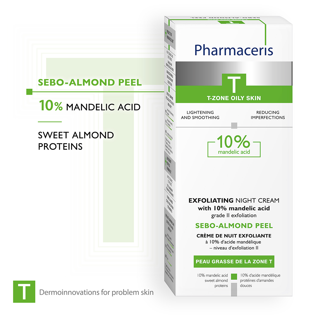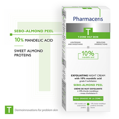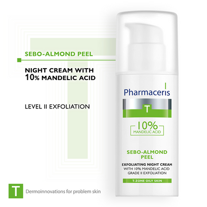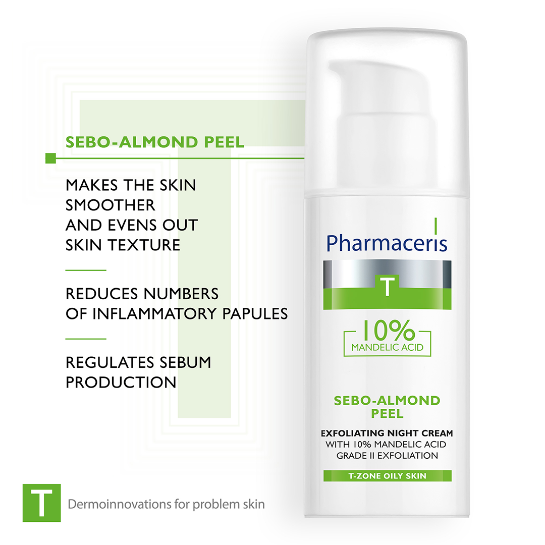 ''Wake up to radiant and clear, shine-free skin with the Pharmaceris T Sebo-Almond Peel Night Cream, an exfoliating and skin-perfecting overnight moisturiser that tackles acne, spots and oiliness as you sleep.'' - Caitlin, Escentual Beauty Team.