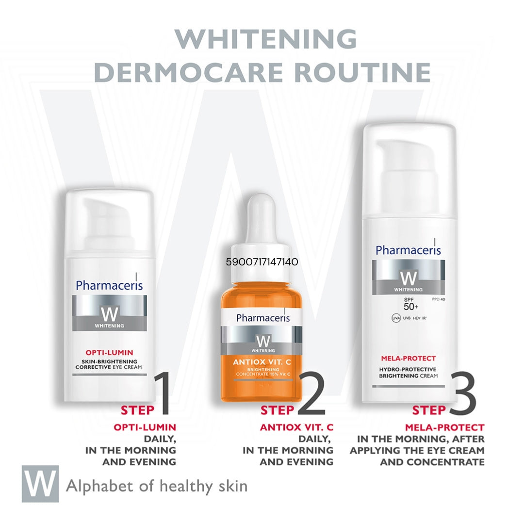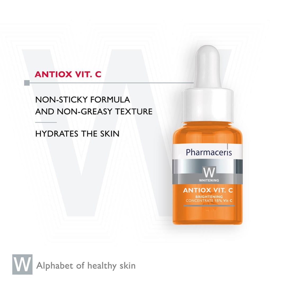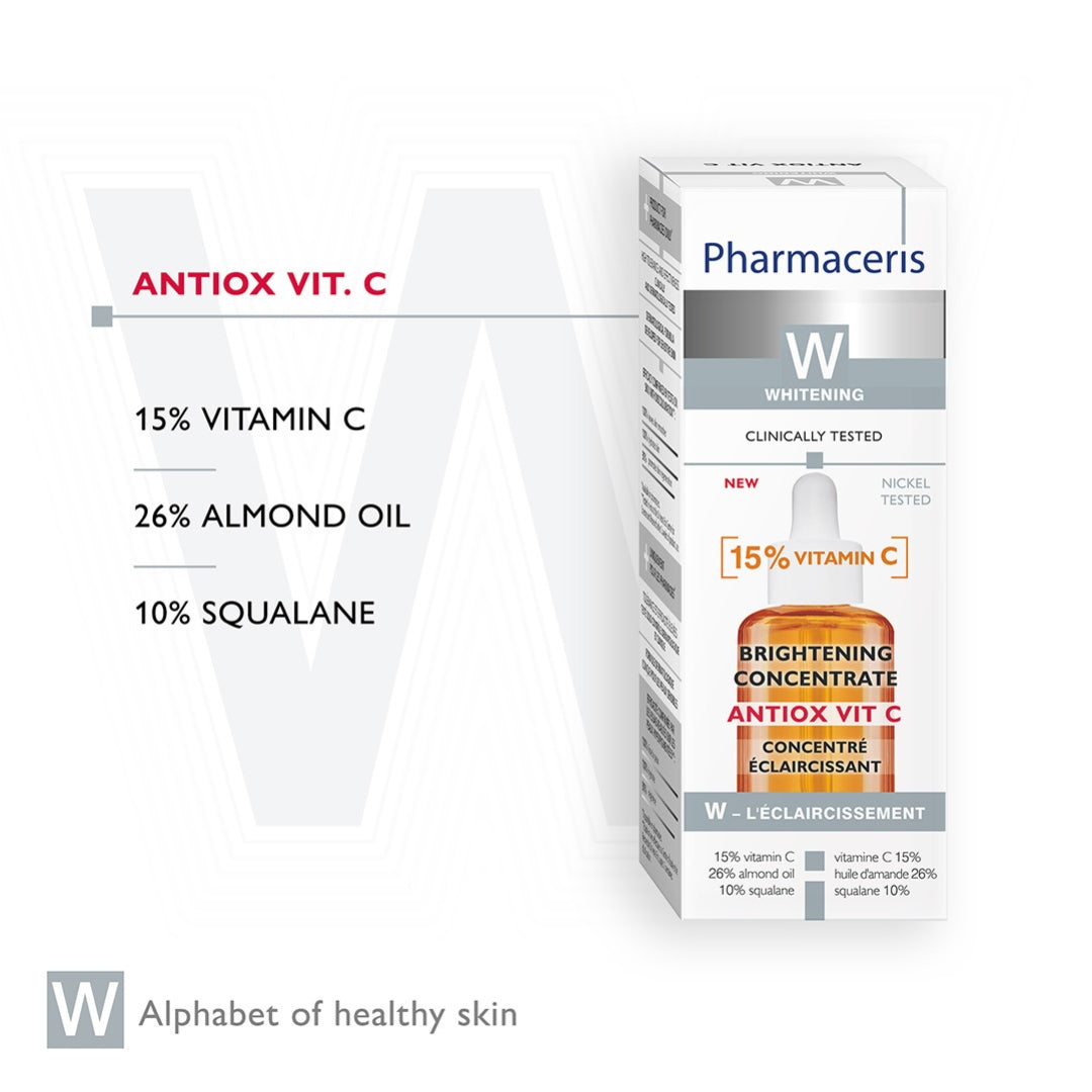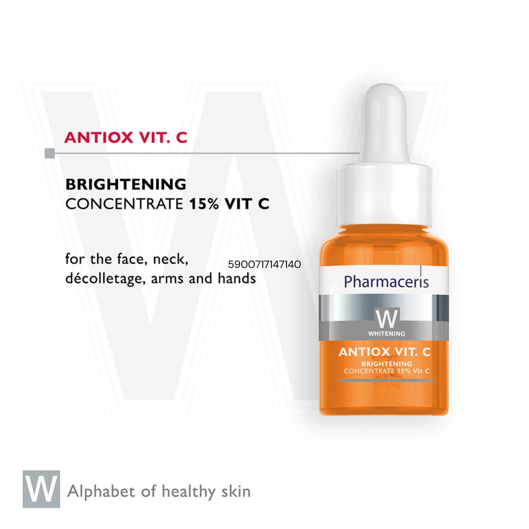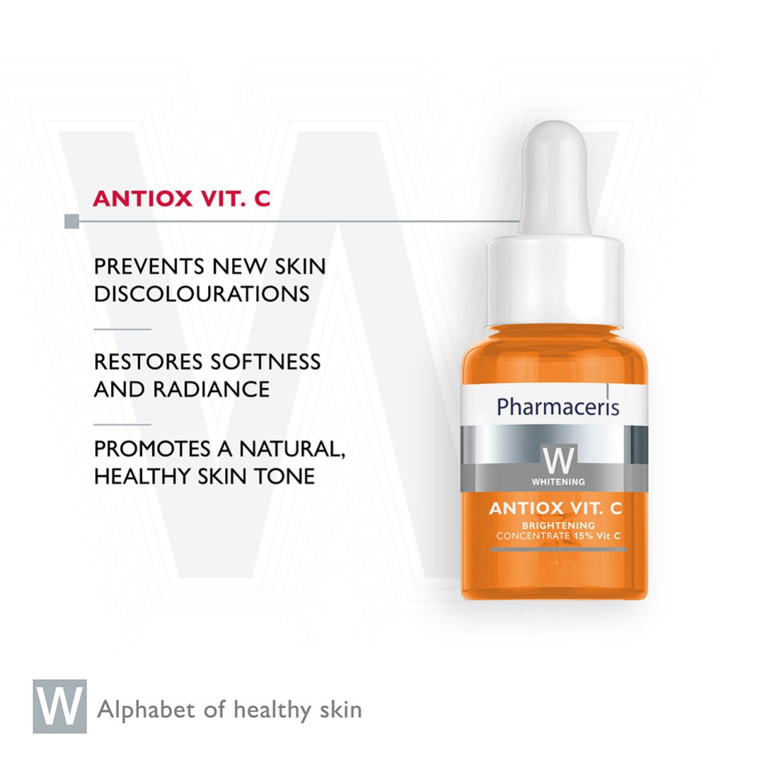 Concentrate with biologically active 15% vitamin C controls excessive melanin production, with a targeted effect on reducing existing discolourations and promoting natural skin repair. In addition to contributing to the protection of the DNA of skin cells, it mitigates the detrimental impacts of UV radiation, decreasing the visibility of UV-induced spots. It stimulates collagen synthesis, improving skin elasticity and firmness.