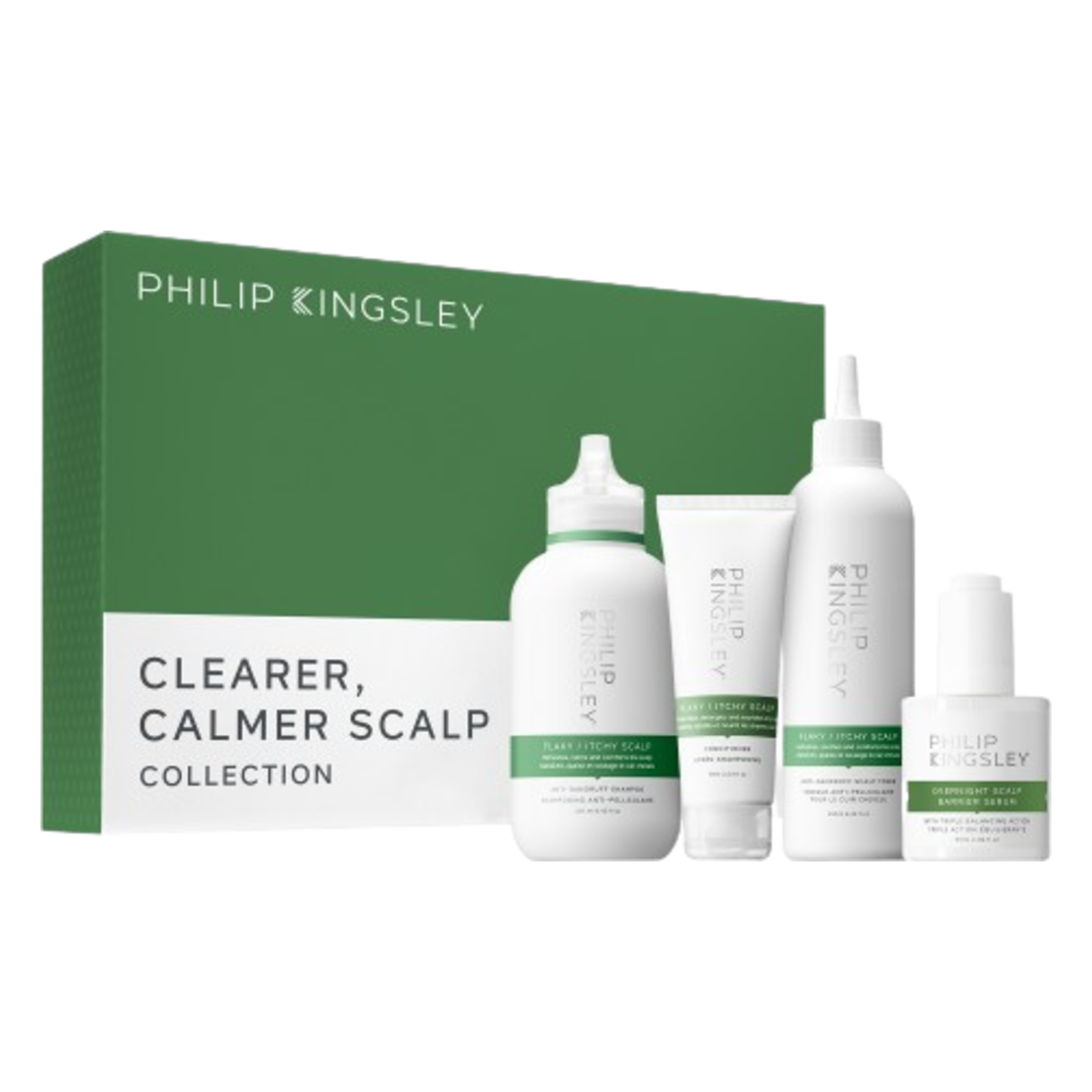 Starring three soothing, flake-fighting heroes from the award-winning Philip Kingsley Flaky/Itchy Scalp range, paired with the oil, hydration and microflora-balancing Philip Kingsley Overnight Scalp Barrier Serum, this calming quartet will banish flakes, itching and irritation to grant your healthiest scalp yet. Say goodbye to dandruff and hello to an instantly calmer, happier, balanced scalp.
