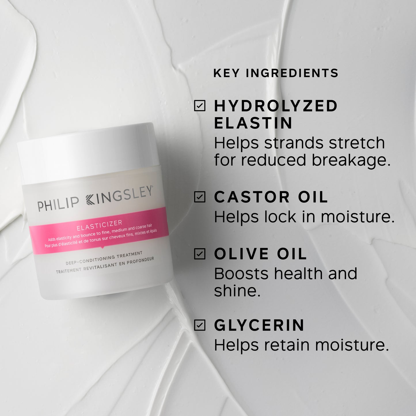 - Adds elasticity, hydration and bounce to all hair types.
