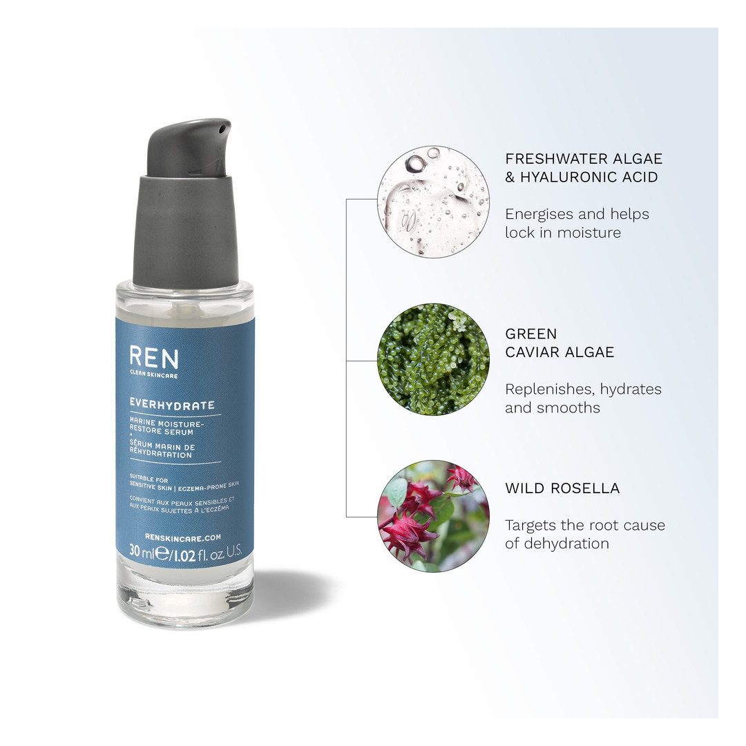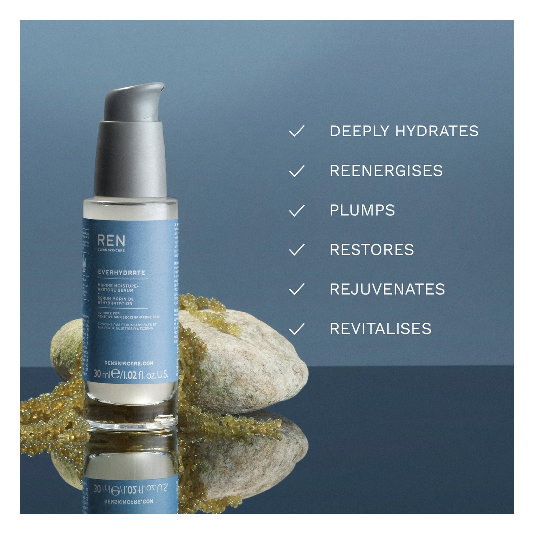 "REN Marine Moisture Serum deeply hydrates the deep layers of your skin with hyaluronic acid and a blend of potent tropical and marine plants to provide lasting, intensive hydration." - Melisa, Escentual Beauty Team.