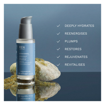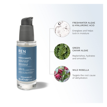 Containing a blend of active ingredients such as hyaluronic acid and potent marine, and tropical plants like algae and wild rosella, the fast-absorbing REN Everhydrate Marine Serum deeply moisturises the skin by penetrating its layers and addressing the root cause of dehydration. This results in revitalised, plumped and smoothed skin while alleviating any discomfort caused by dehydration.