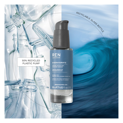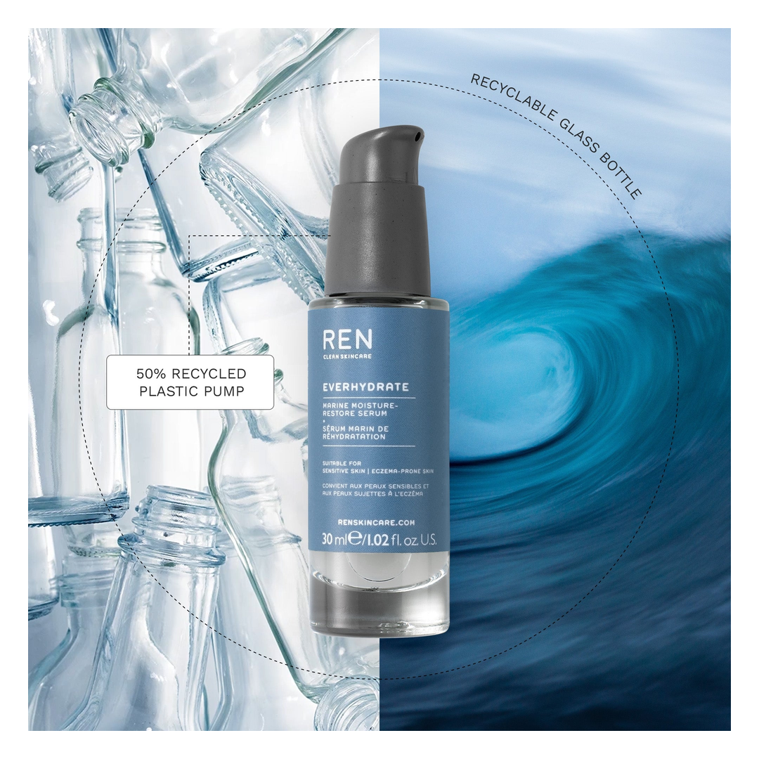 - REN prioritises sustainable packaging and offers this serum in a recyclable glass bottle with a twist lock pump made from 50% recycled plastic.