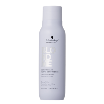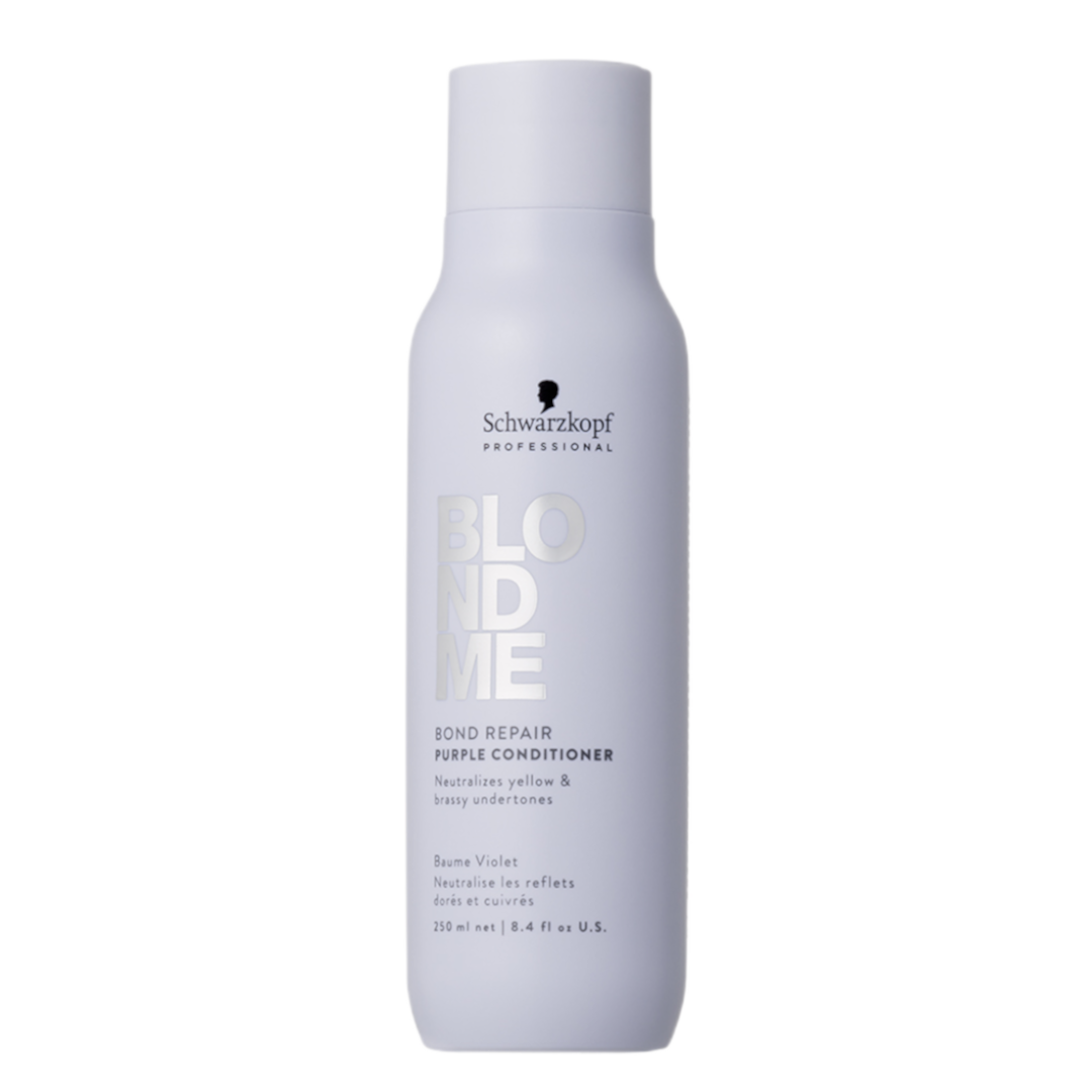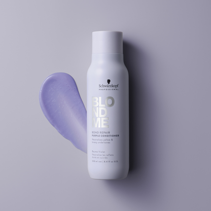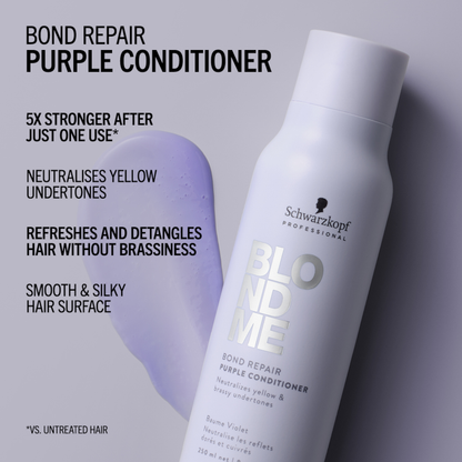 Neutralising yellow undertones and helping to prevent brassiness, BlondMe Bond Repair Purple Conditioner with BOND REPAIR TECHNOLOGY intensively conditions the hair with a softening formula, instantly detangling from the lengths to ends and providing a silky feeling. Enriched with Almond Oil and Cornflower, the conditioner delivers targeted levels of cool pigments to maintain a fresh cool tone direction for improved blonde clarity, without changing the hair colour. Restoring radiance and shine, it strengthens the hair by building inner hair bonds, repairing damage equivalent to two lightening services after just one use.