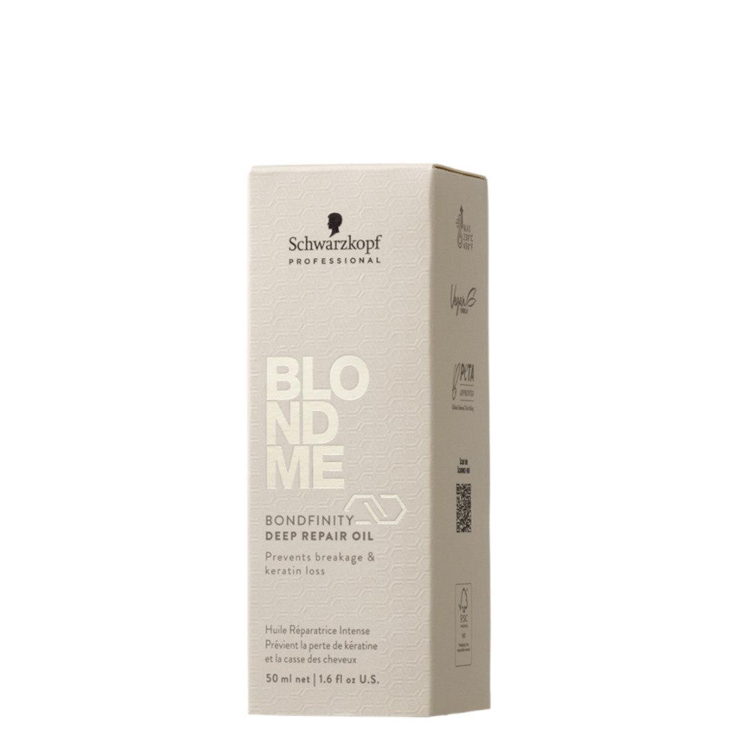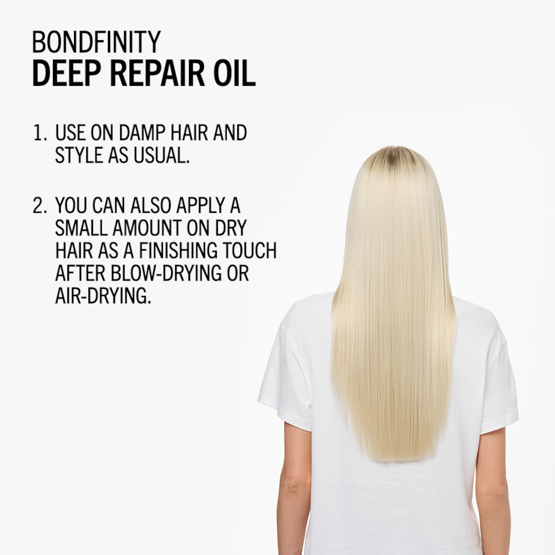 Deeply repairing and strengthening blonde and lightened hair without weighing it down, BlondMe Deep Repair Oil with BONDFINITY TECHNOLOGY restores the hairs' health by creating resilient hair bonds and locking in the hairs' own keratin – pro-active, permanent repair for hair that is 20 times stronger after just one use*. What's more, it smoothes porous hair for beautiful shine, thanks to 24 hour frizz control, and protects it from styling damage with 230°C/450°F heat protection.