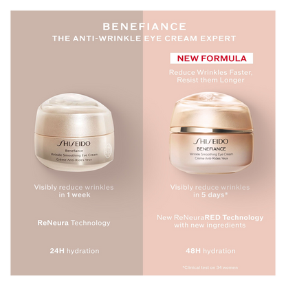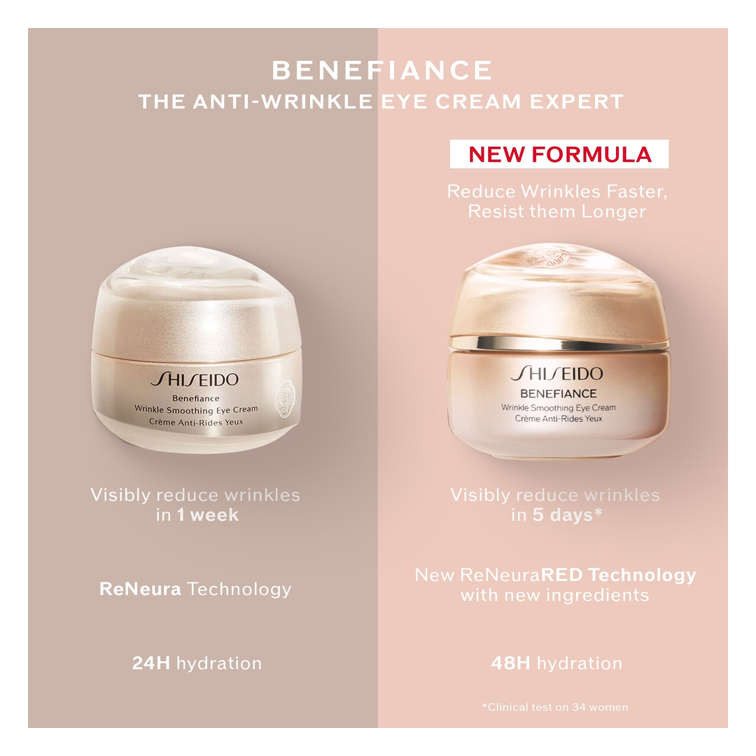 Shiseido Benefiance Wrinkle Smoothing Eye Cream, a velvety eye cream that helps to visibly improve six types of wrinkles, including crow's feet and stress wrinkles. Delivers 48 hours of moisture for firm, smooth and youthful radiant skin.