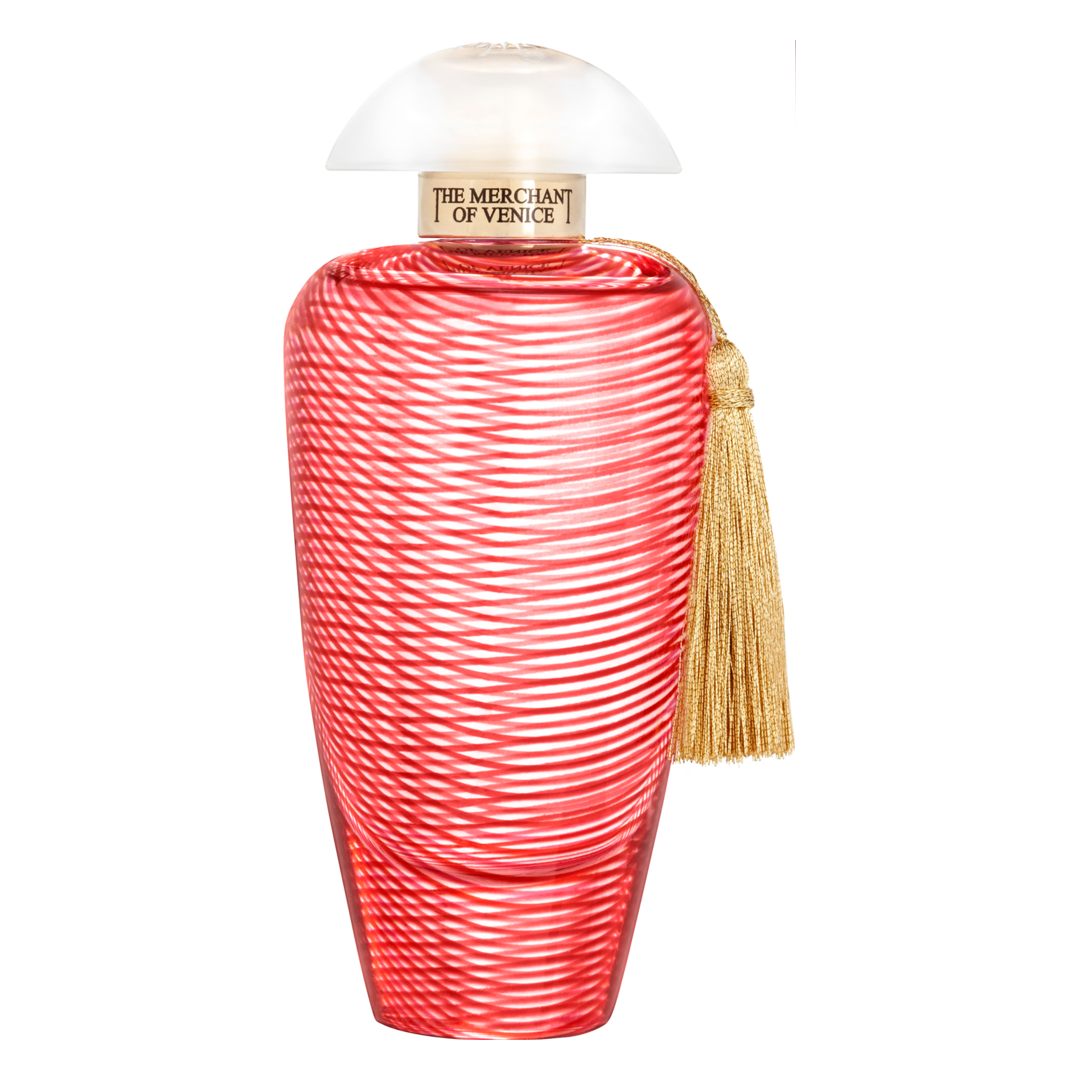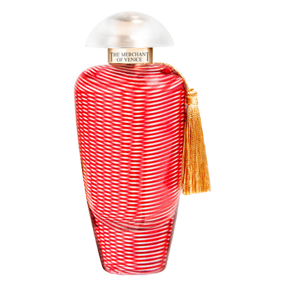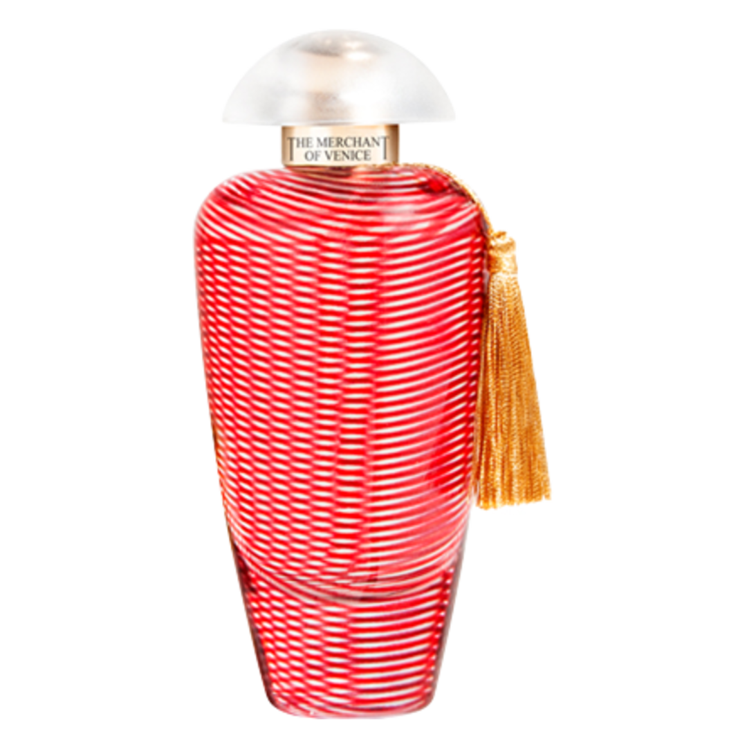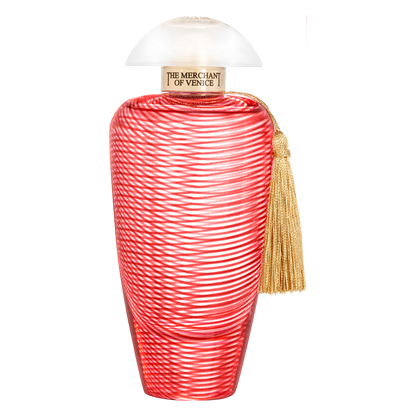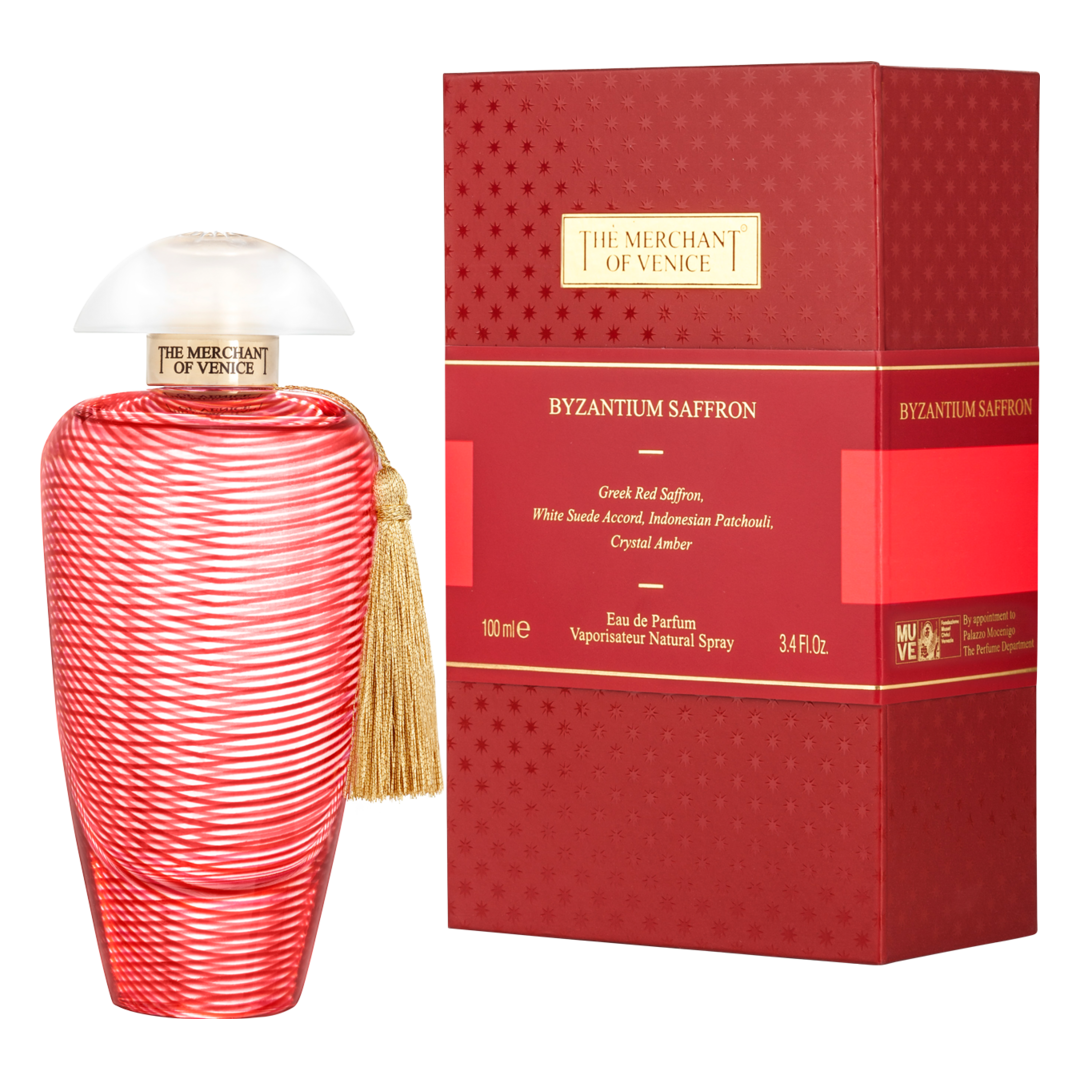 The fragrance Byzantium Saffron expresses its strength through a vibrant red flacon. The dazzling design gives the strong impression of the precious Saffron contained in the fragrance. It is decorated with a golden tassel and a white, semi-transparent cap through which we can view the wind rose.
