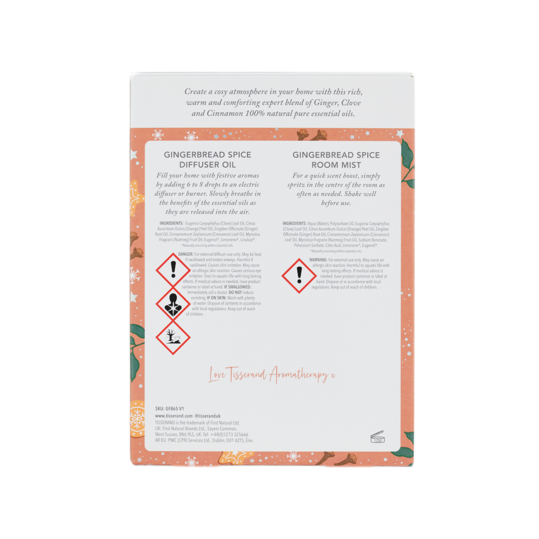 Gingerbread Spice Body and Room Mist Ingredients: Aqua (Water), Polysorbate 20, Eugenia Caryophyllus (Clove) Leaf Oil, Citrus Aurantium Dulcis (Orange) Peel Oil, Zingiber Officinale (Ginger) Root Oil, Cinnamomum Zeylanicum (Cinnamon) Leaf Oil, Myristica Fragrans (Nutmeg) Fruit Oil, Sodium Benzoate, Potassium Sorbate, Citric Acid, Limonene*, Linalool*, Eugenol*.*Naturally Occurring Within Essential Oils.Gingerbread Spice Diffuser Oil Ingredients: Eugenia Caryophyllus (Clove) Leaf Oil, Citrus Aurantium Dulcis (Orange) Peel Oil, Zingiber Officinale (Ginger) Root Oil, Cinnamomum Zeylanicum (Cinnamon) Leaf Oil, Myristica Fragrans (Nutmeg) Fruit Oil, Eugenol*, Limonene*, Linalool*.*Naturally occurring within essential oils.