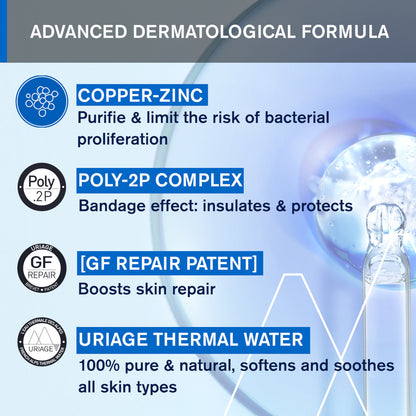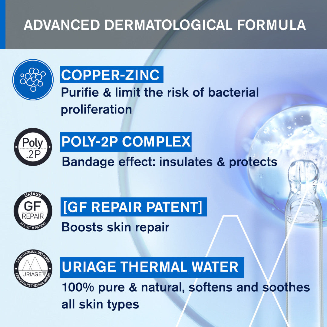 The Poly-2P patent creates an immediate bandage effect that insulates and protects. Smectite absorbs and neutralizes, while the combination of Copper Zinc and Uriage Thermal Water delivers a purifying and anti-irritation effect.