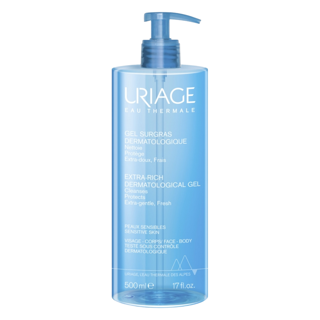 Cleanse skin with the Uriage Extra-Rich Dermatological Cleansing Gel, a universal soap-free face, body and hair wash for all skin types, including sensitive and suitable for the whole family to use.