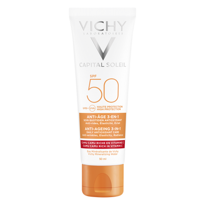 Protect your skin against the ageing effects of the sun with Vichy Capital Soleil Anti-Ageing 3-In-1 Daily Antioxidant Care SPF50.