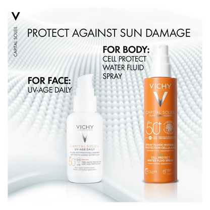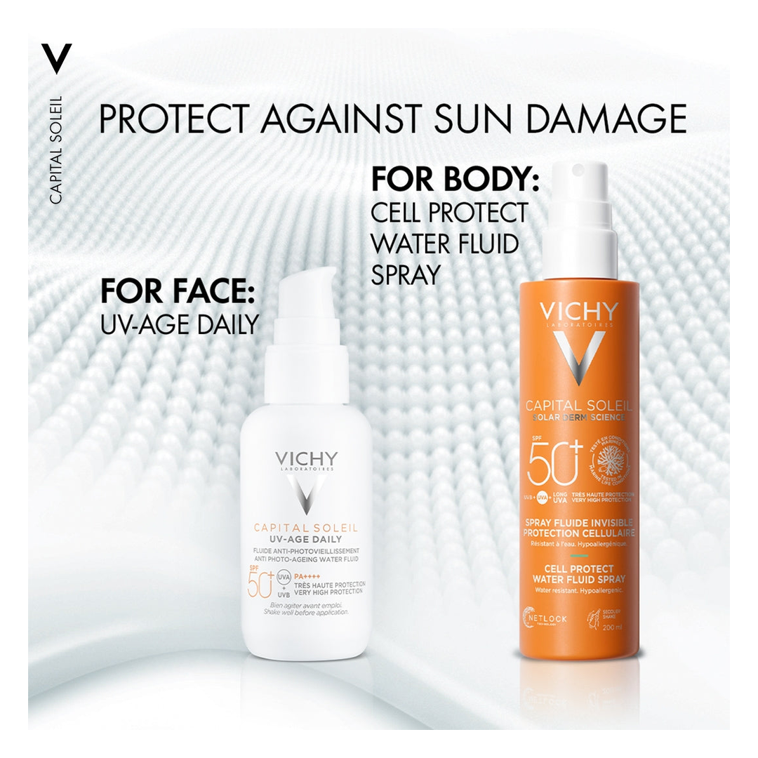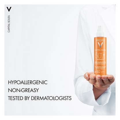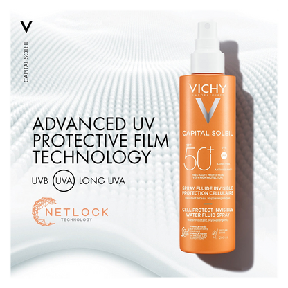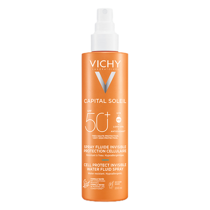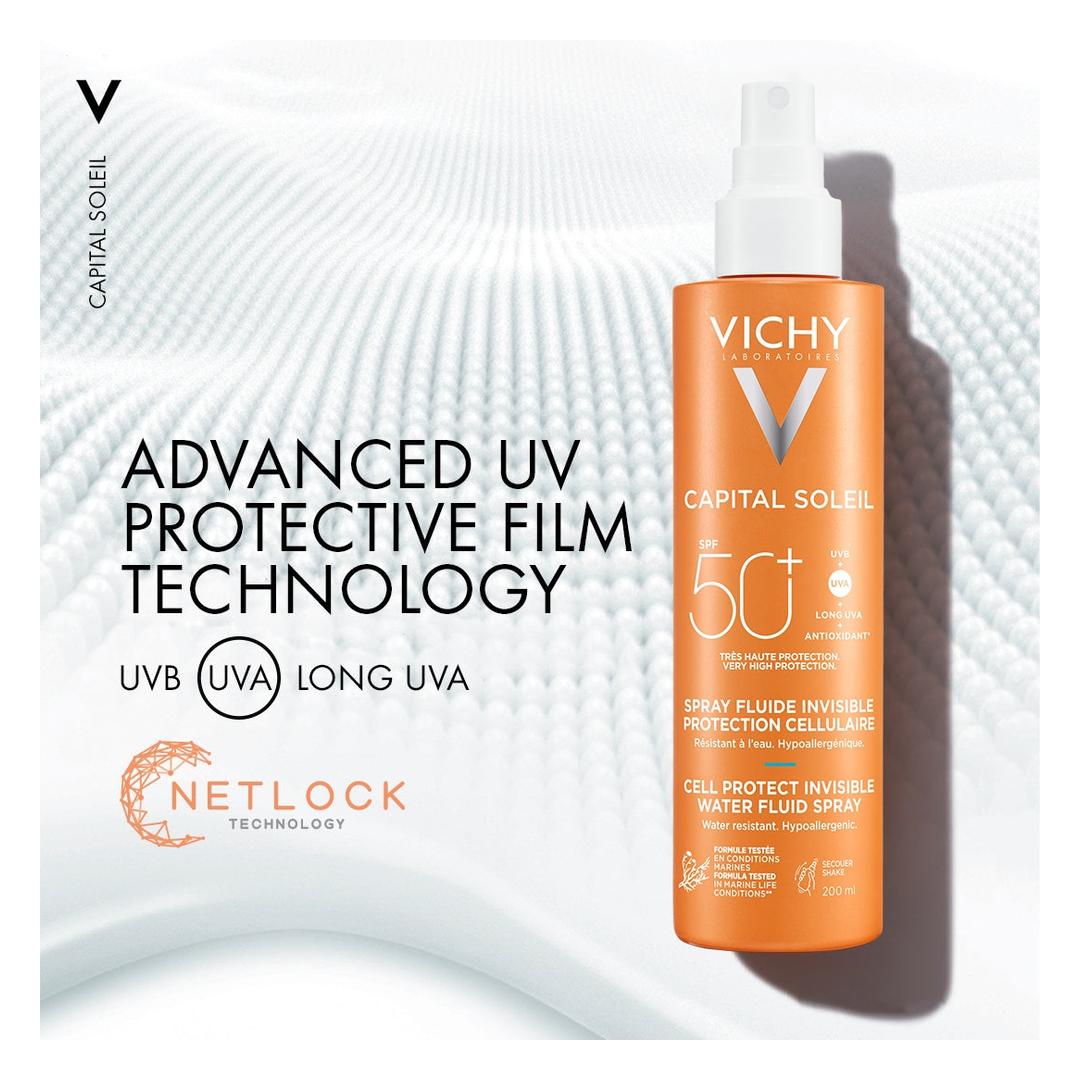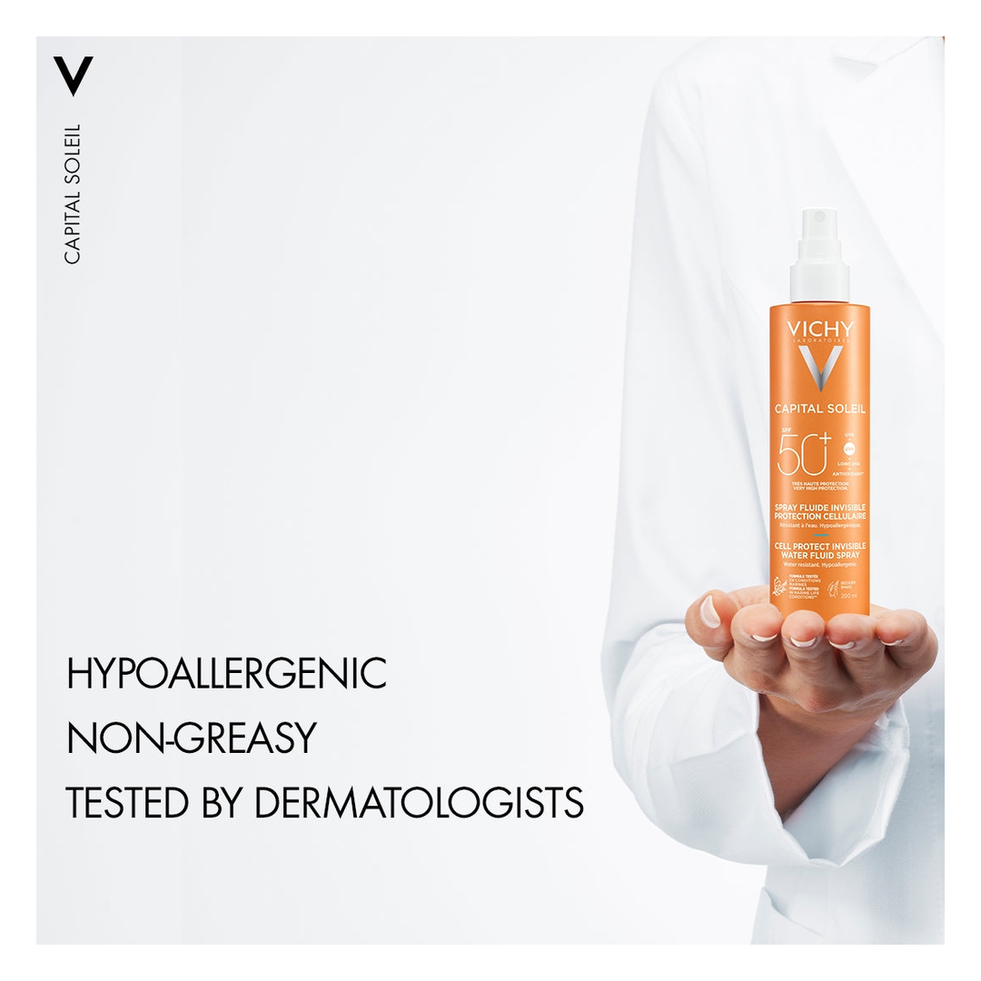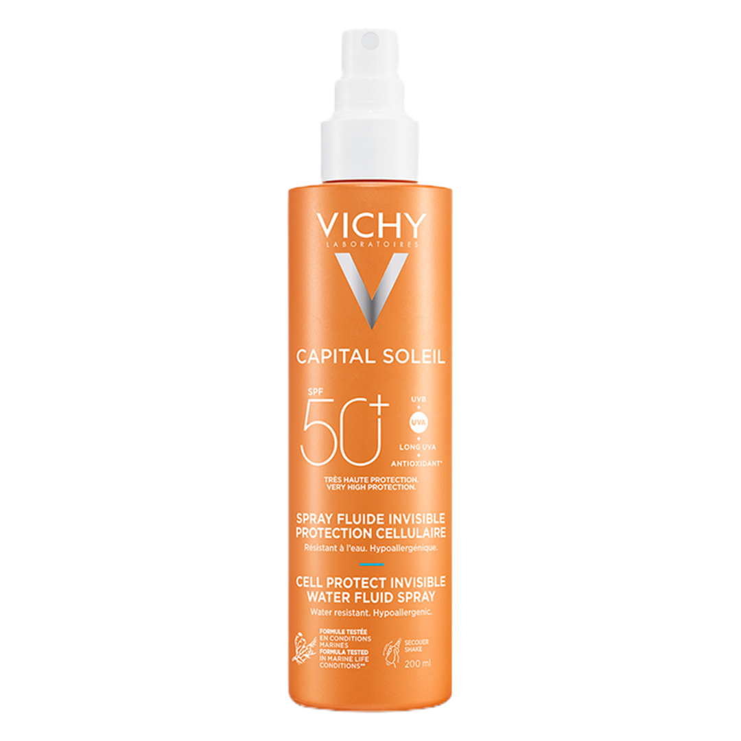 With solar Dermatological Science, Capital Soleil Cell Protect Spray is an ultra lightweight, invisible finish water fluid spray for face and body, suitable for all skin types.