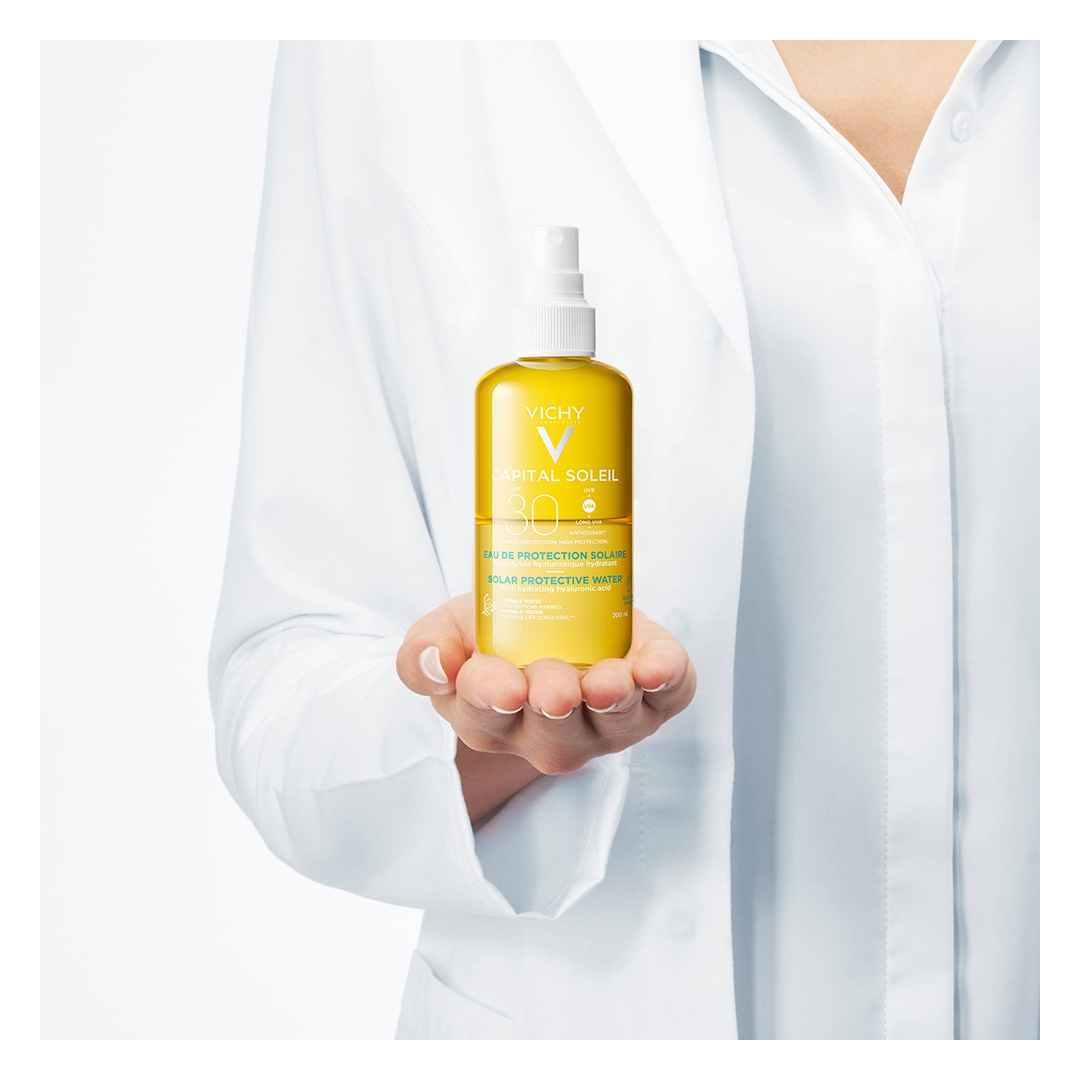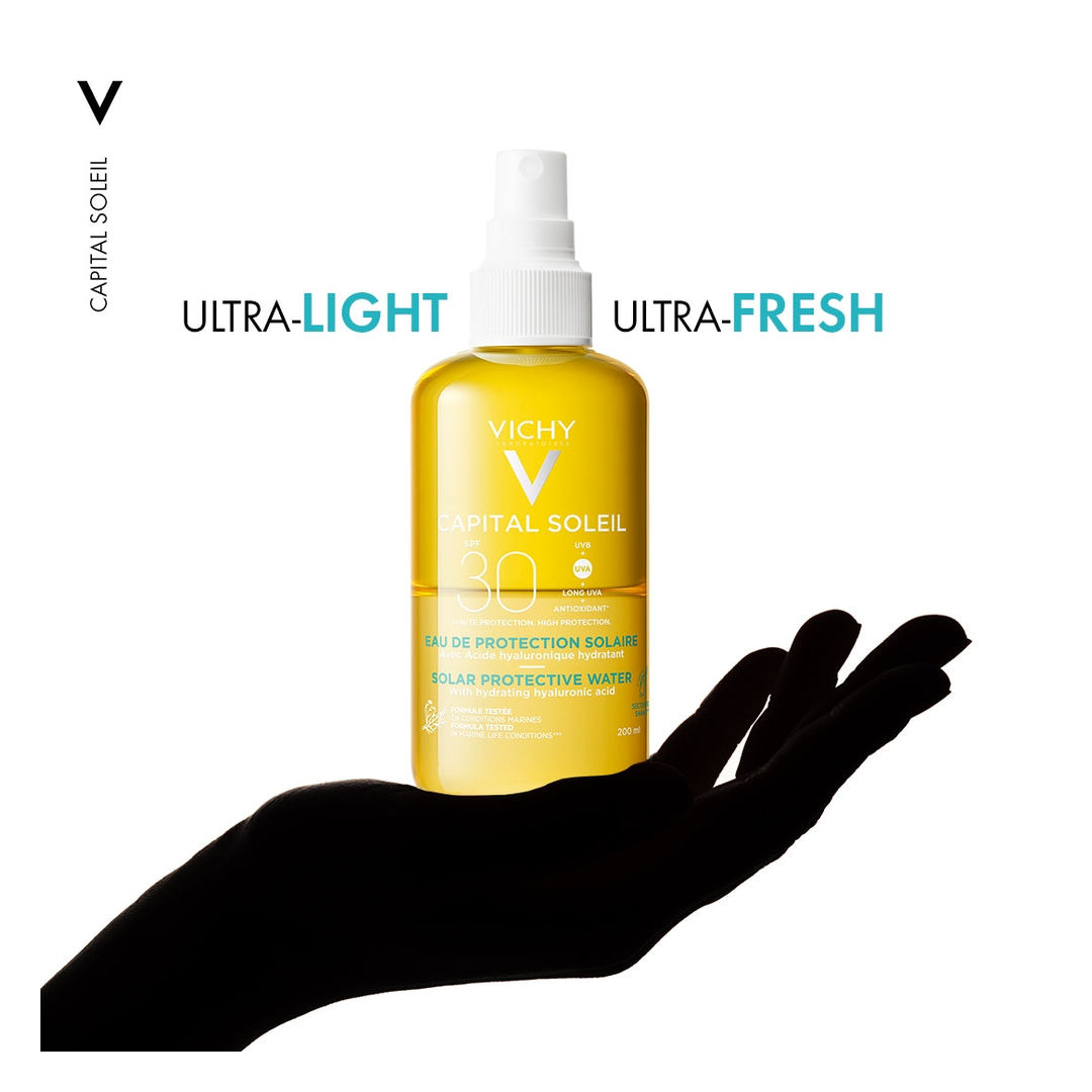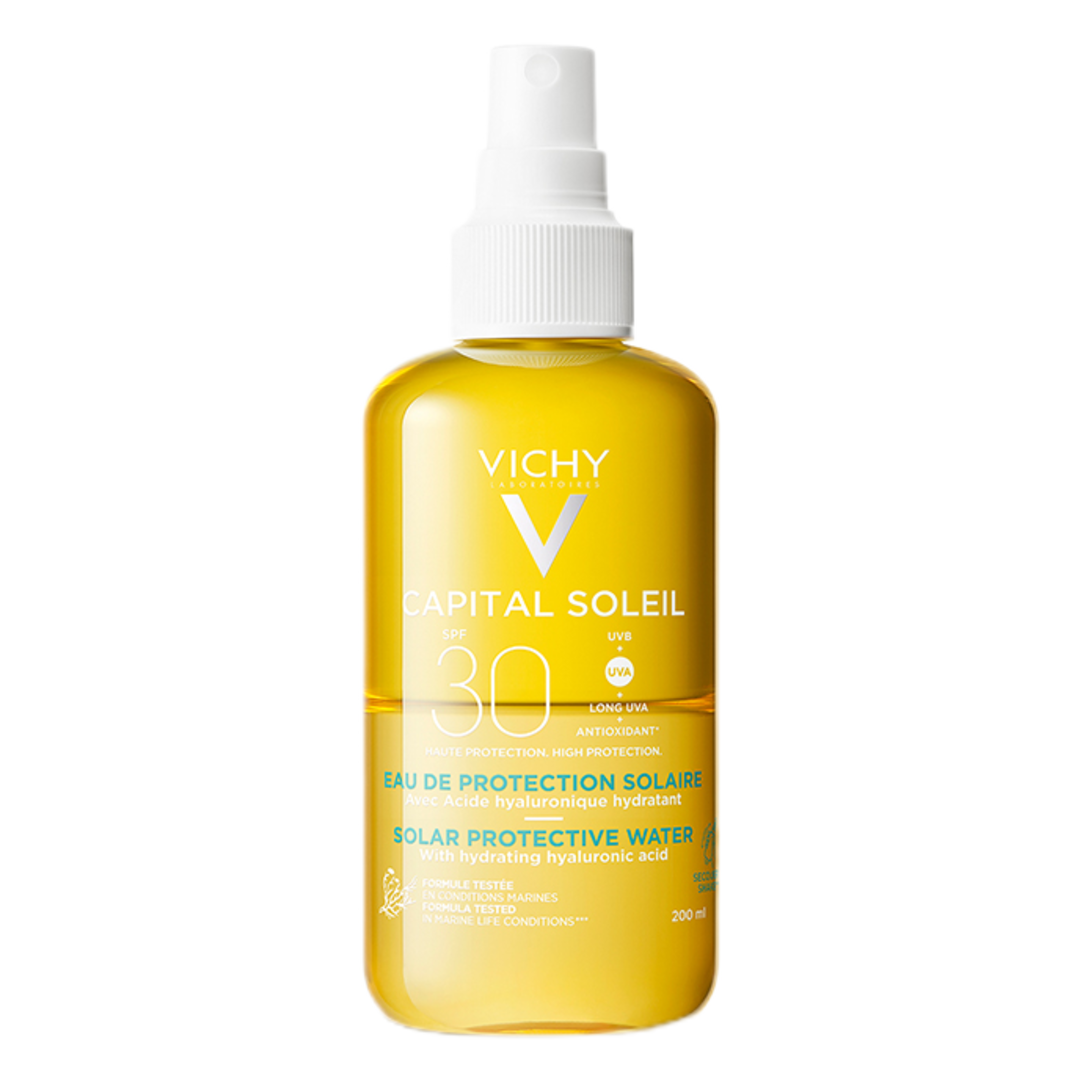 Delight in the skin-quenching protection of the Capital Soleil Solar Protective Water Hydrating SPF30, enriched with Vichy Volcanic Water and Hyaluronic Acid to protect and hydrate sensitive skin. Perfect for the face and body, this lightweight, fast-absorbing formula provides broad-spectrum SPF30 in a 40% Vichy Volcanic Water formula for optimal hydration and high protection against UVA and UVB rays.
