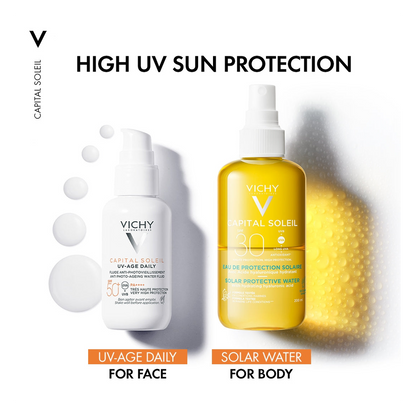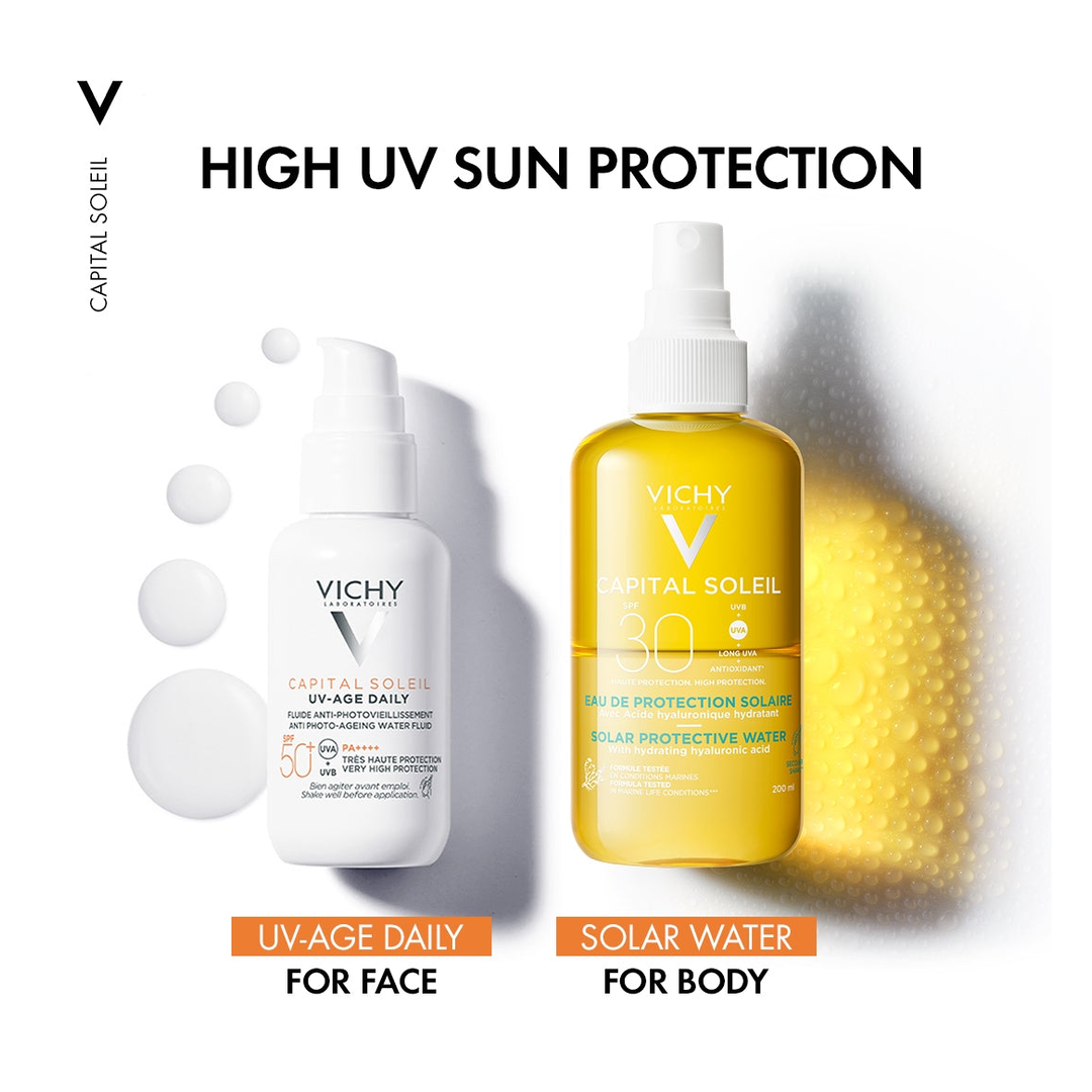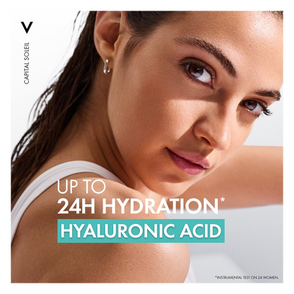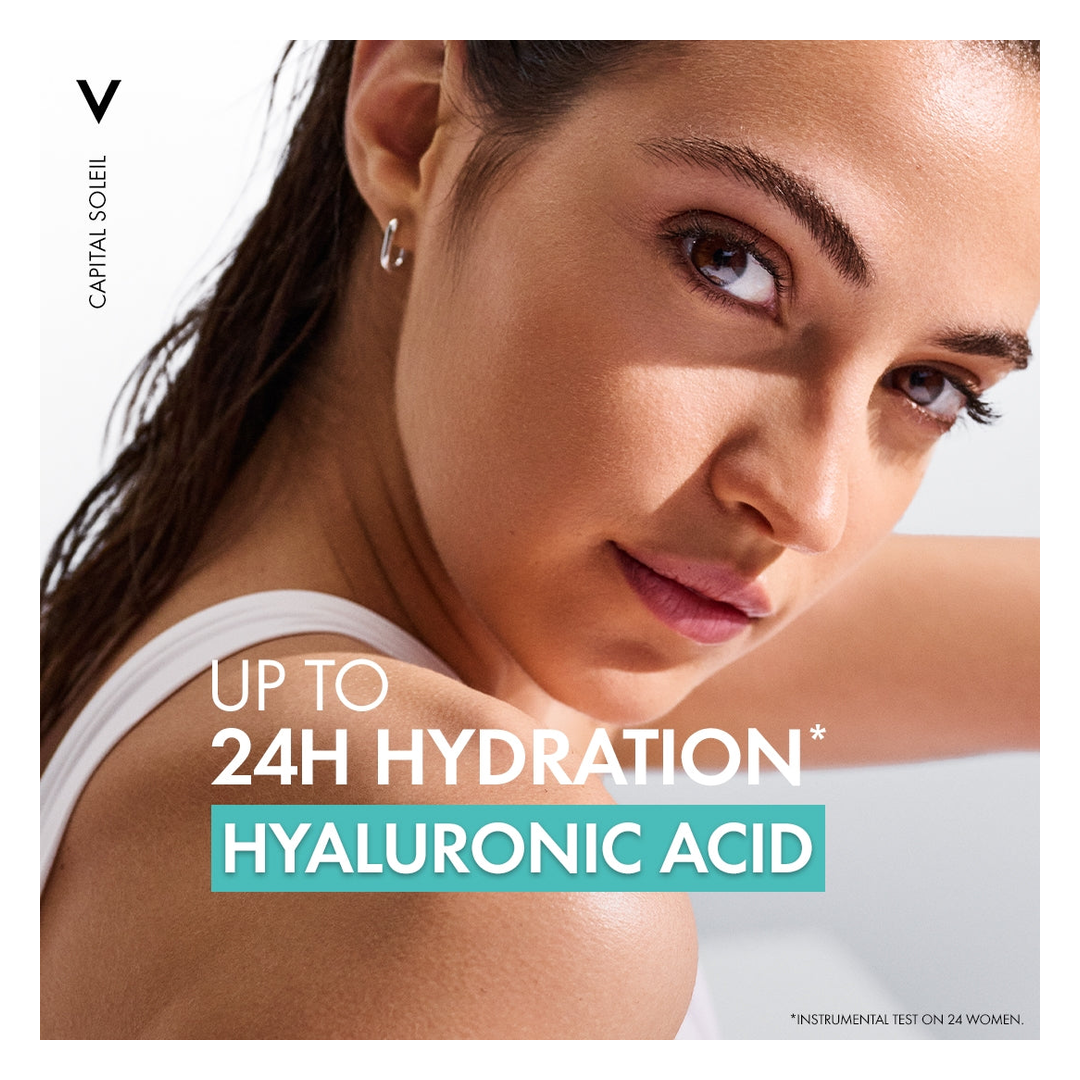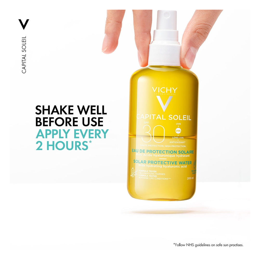 Delight in the skin-quenching protection of the Capital Soleil Solar Protective Water Hydrating SPF30, enriched with Vichy Volcanic Water and Hyaluronic Acid to protect and hydrate sensitive skin. Perfect for the face and body, this lightweight, fast-absorbing formula provides broad-spectrum SPF30 in a 40% Vichy Volcanic Water formula for optimal hydration and high protection against UVA and UVB rays.
