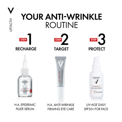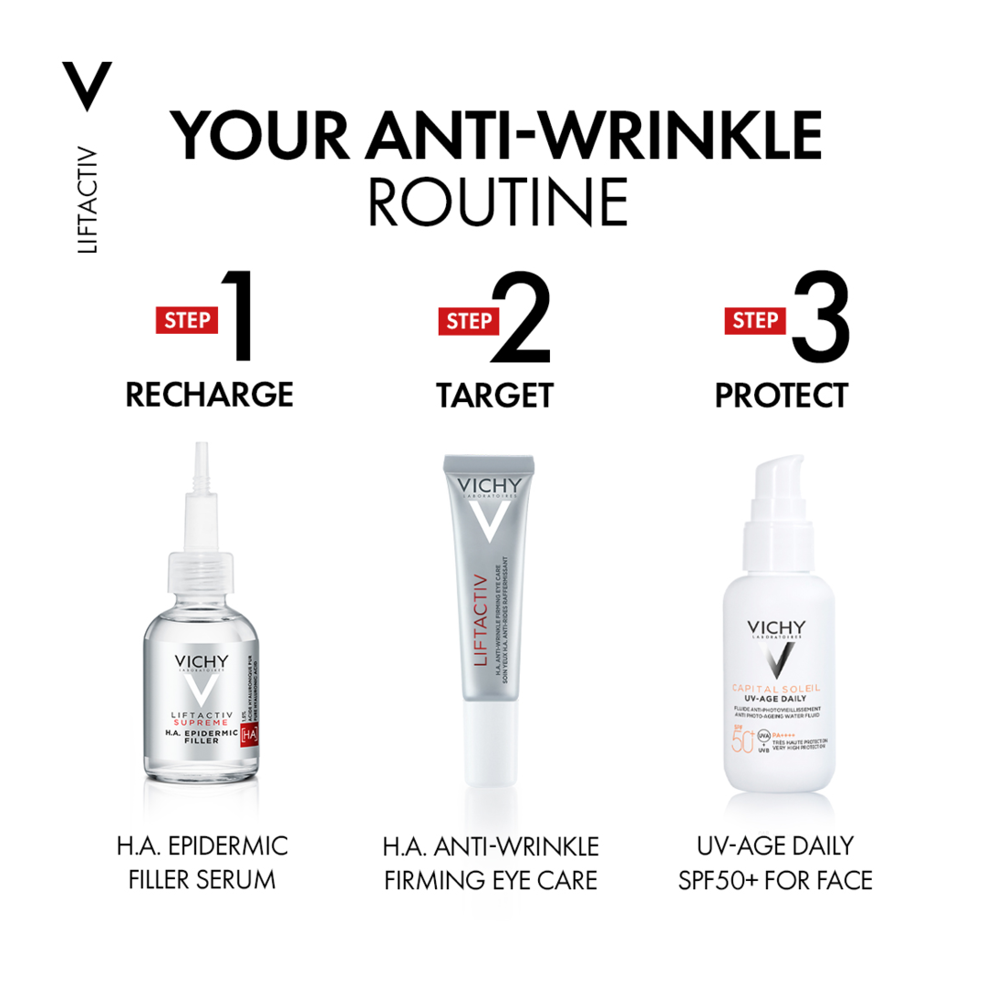 Liftactiv Supreme Eyes has had an upgrade. Discover the improved formula of Liftactiv H.A. Anti-Wrinkle Firming Eye Cream, designed to target the appearance of wrinkles, dark circles and under-eye bags. Crow's feet appear reduced and eyelids feel firmer.