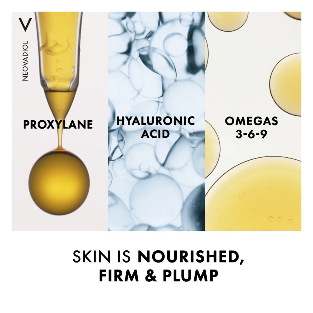 Improve skin firmness and minimise the appearance of fine lines around the delicate eye and lip contours with Vichy's Neovadiol Multi-Corrective Eye and Lip Care. Enriched with a skin nourishing combination of 3% Proxylane, Cassia seed extract, 1% Niacinamide, Hyaluronic Acid and Caffeine for brighter eyes and Omegas. This formula works to reduce the impact of hormonal fluctuations at perimenopause and menopause on the skin.